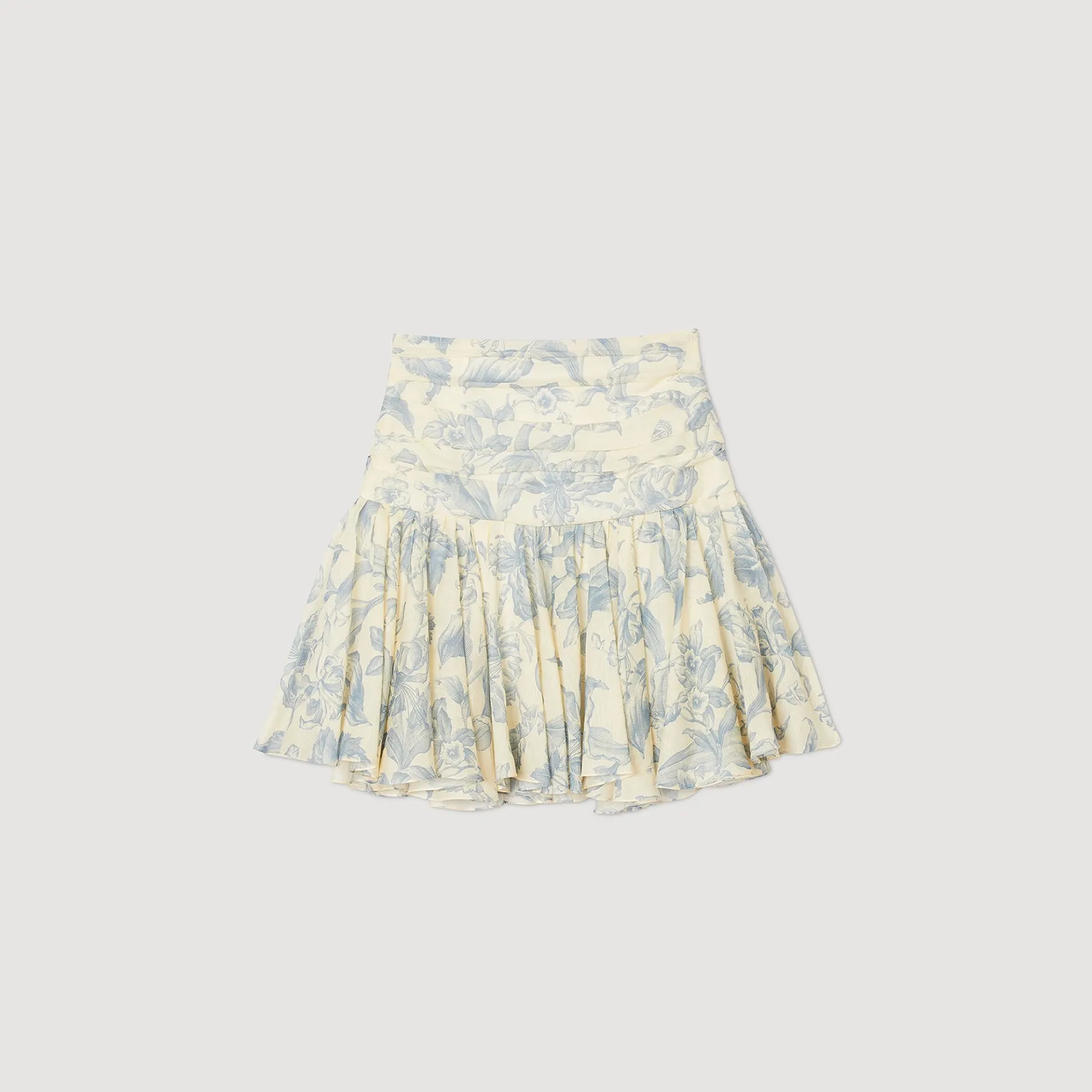 Saia Curta Drapeada E Plissada, Decorada Com Estampa Floral Em Toda A Peça.