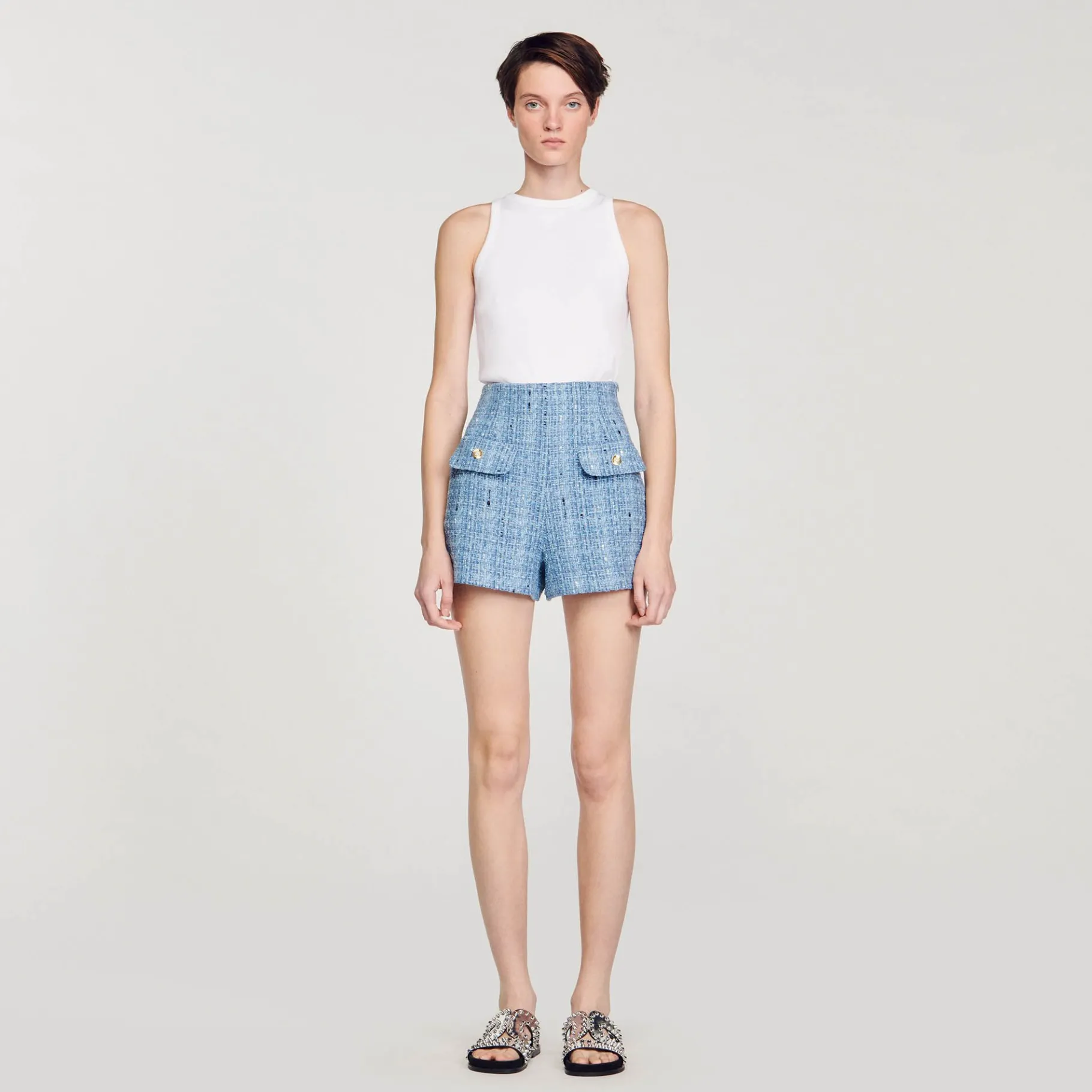 Shorts De Tweed Fantasia De Cintura Alta, Com Bolsos De Aba Na Cintura Decorados Com Botões Fantasia Sandro.