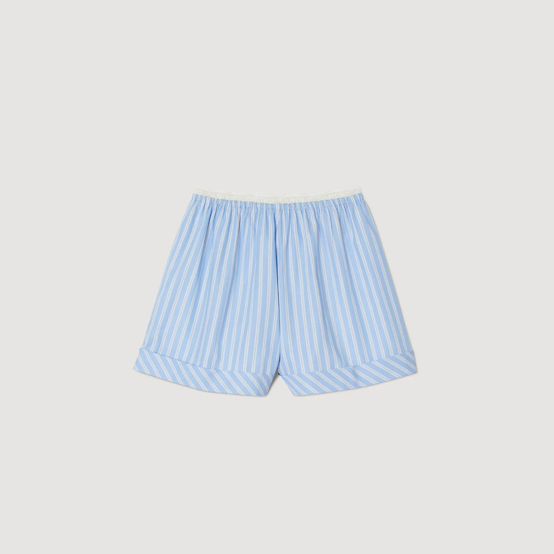 Shorts De Popeline De Algodão Com Listras Largas, Com Cós Elástico E Acabamento Em Renda Na Parte Superior.