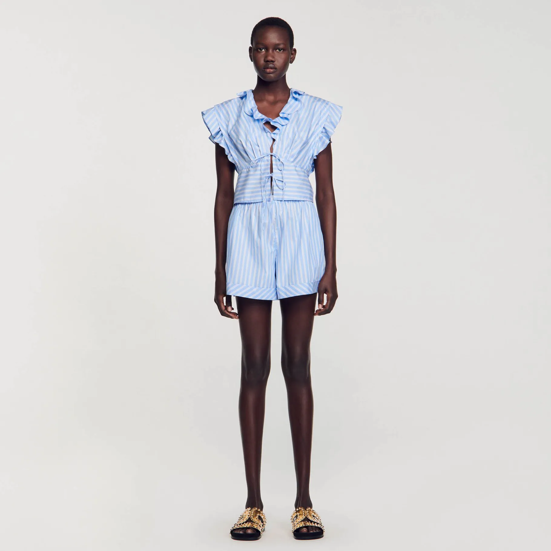 Top Listrado De Popeline De Algodão Com Decote Em V E Mangas Curtas Com Babados, Além De Alças Para Amarrar.