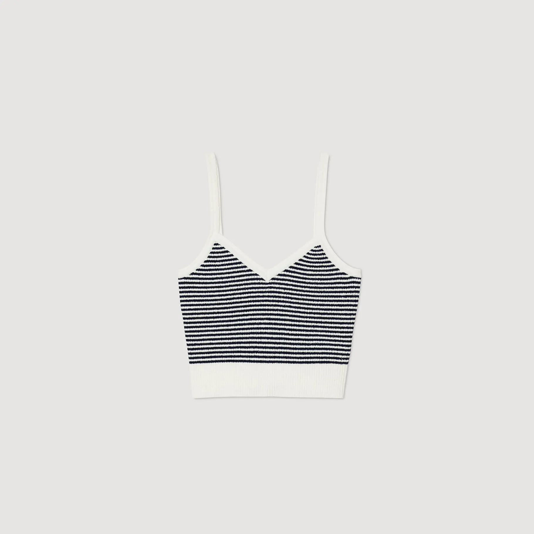 Top Cropped Em Malha Atoalhada Listrada, Com Alças Finas E Acabamento Canelado Contrastante.