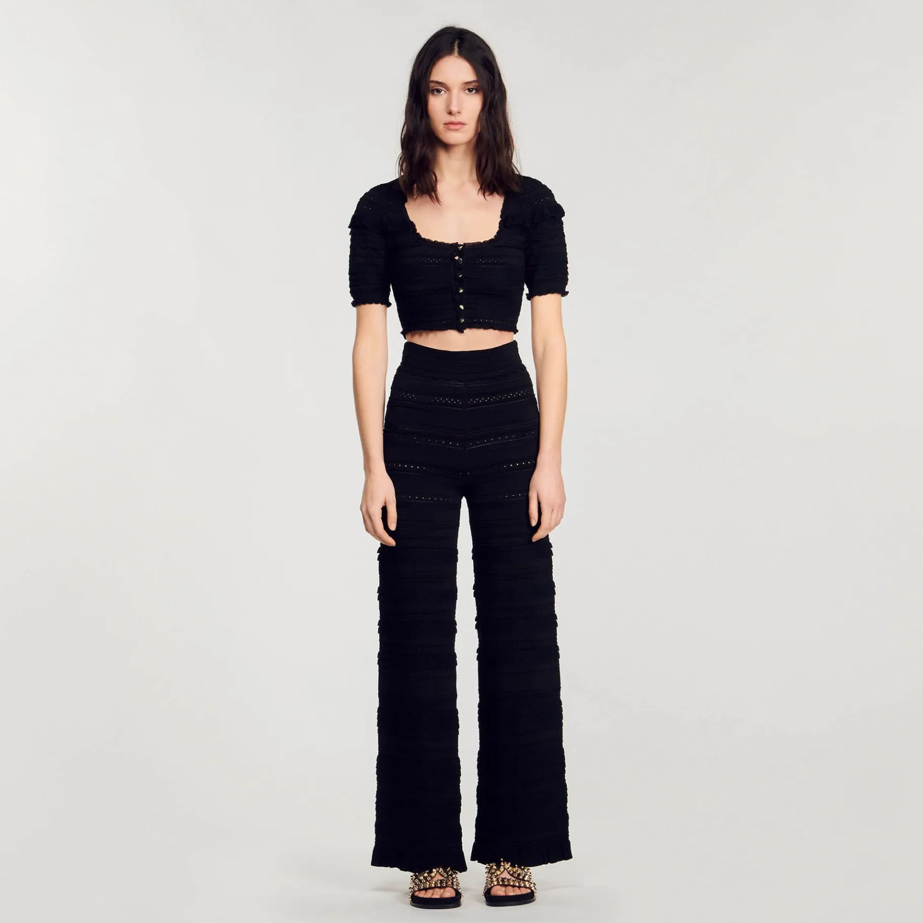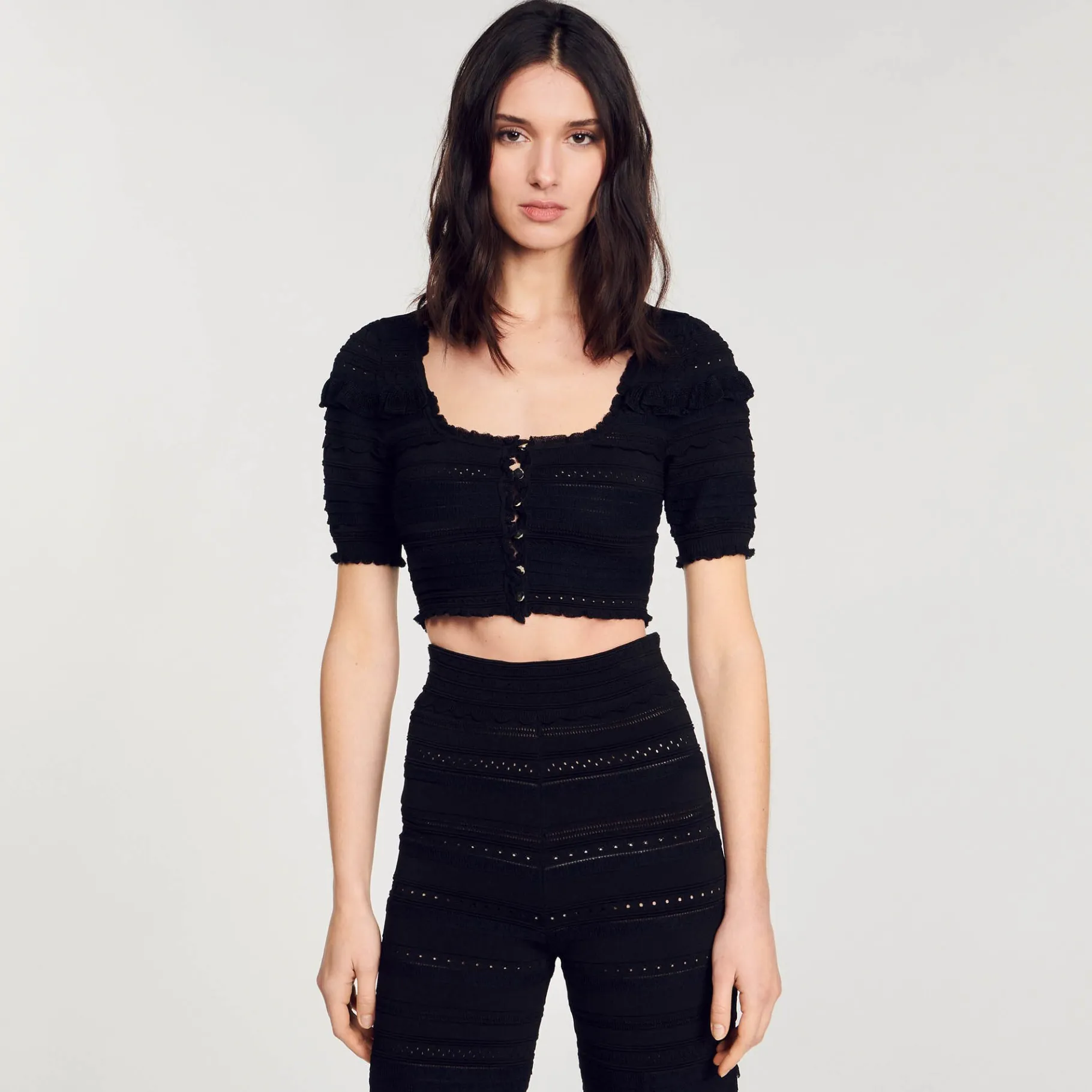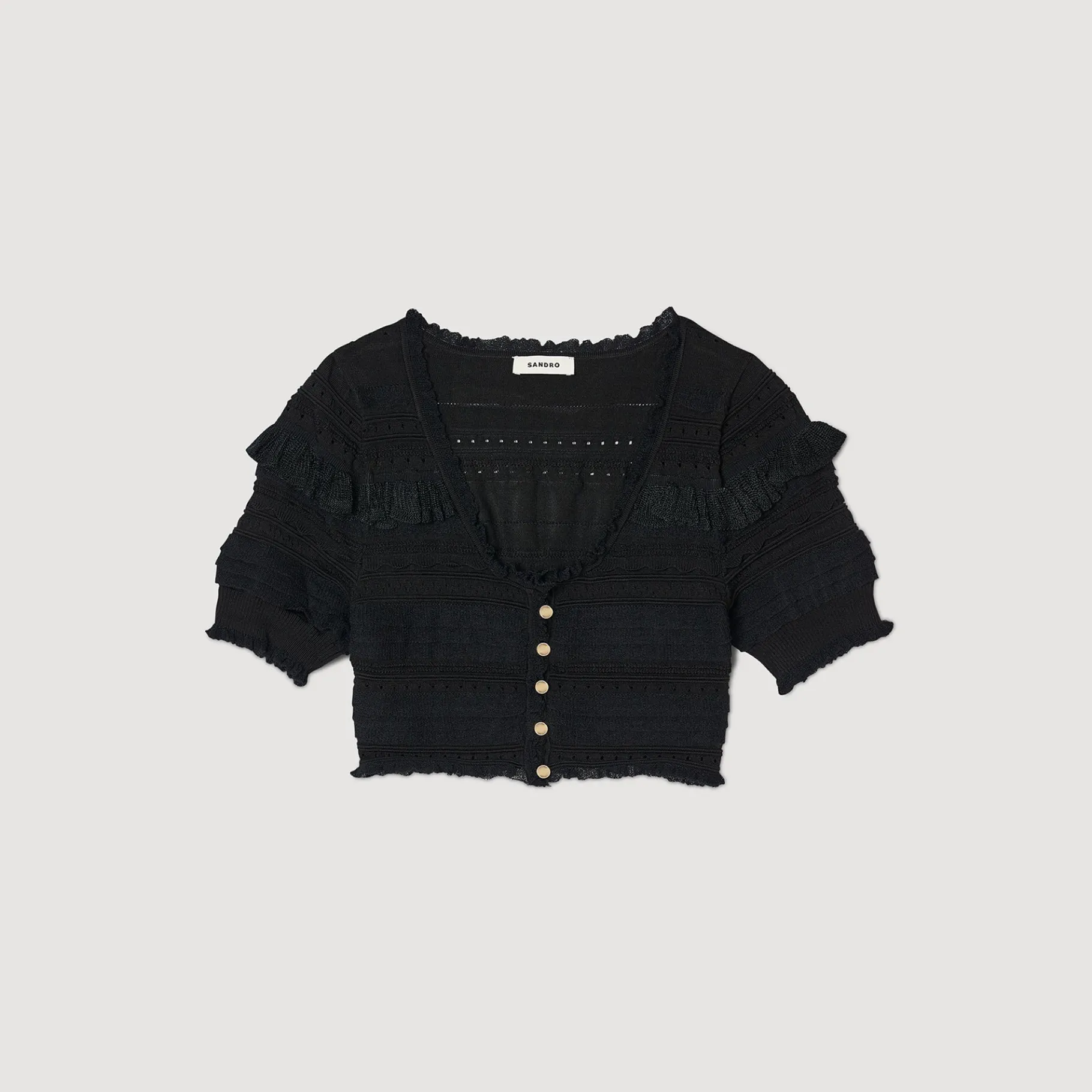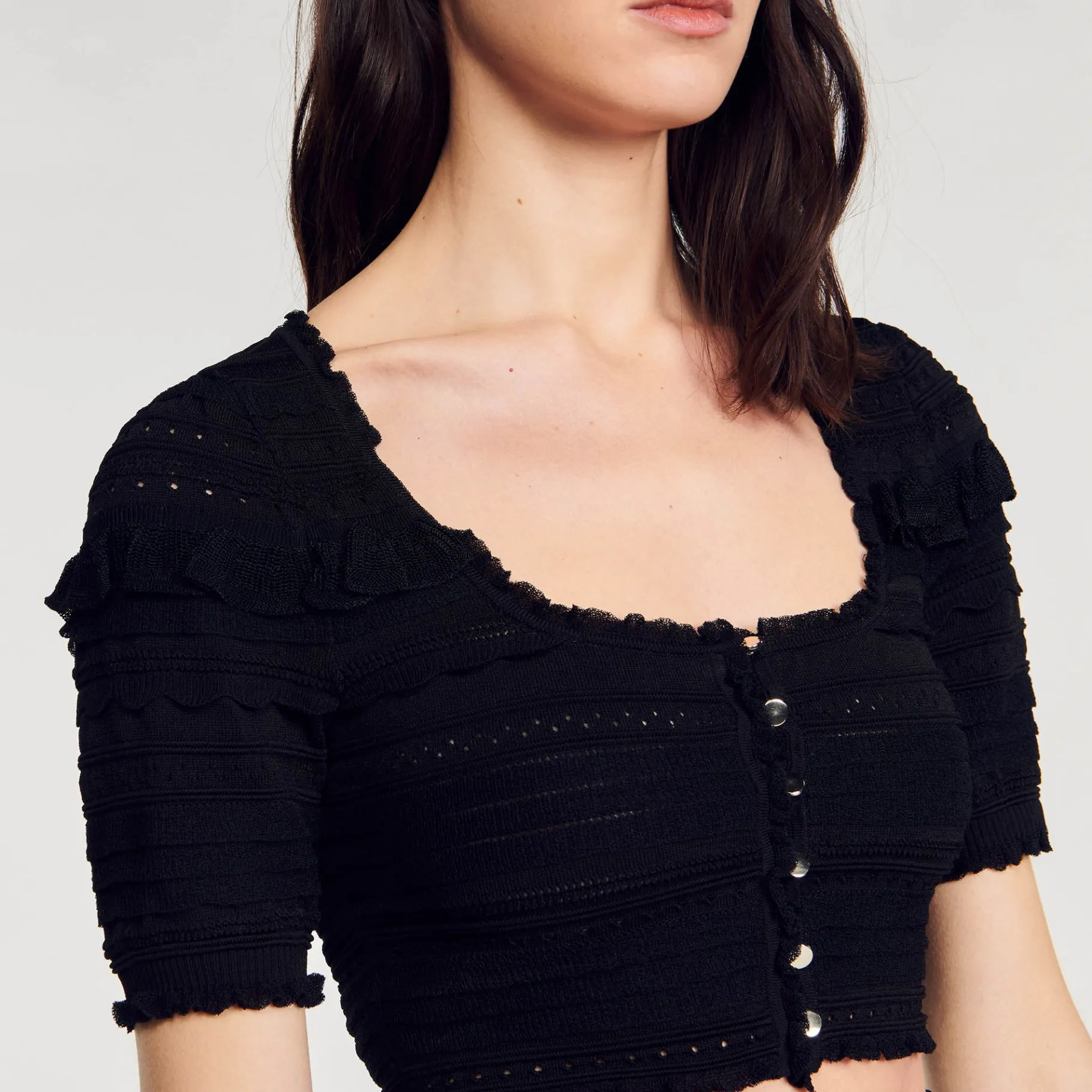 Top Elegante De Malha Estilo Cardigan Decorado Com Babados, Com Mangas Curtas, Decote Baixo E Fecho De Pequeno Botão Dourado.