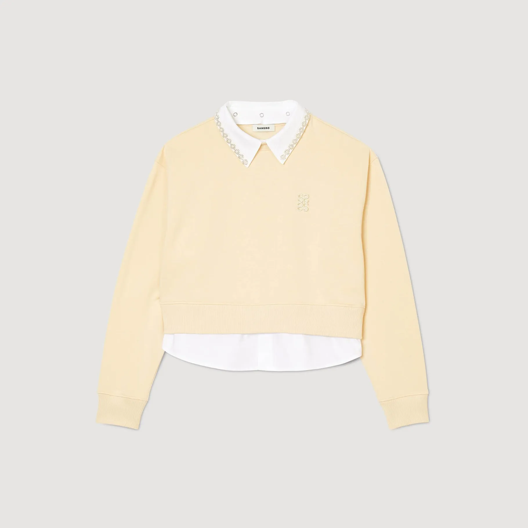 T-Shirt Sweatshirt Com Efeito 2 Em 1 Com Gola Decorada Com Strass, Manga Comprida E Bordado Duplo S No Peito.