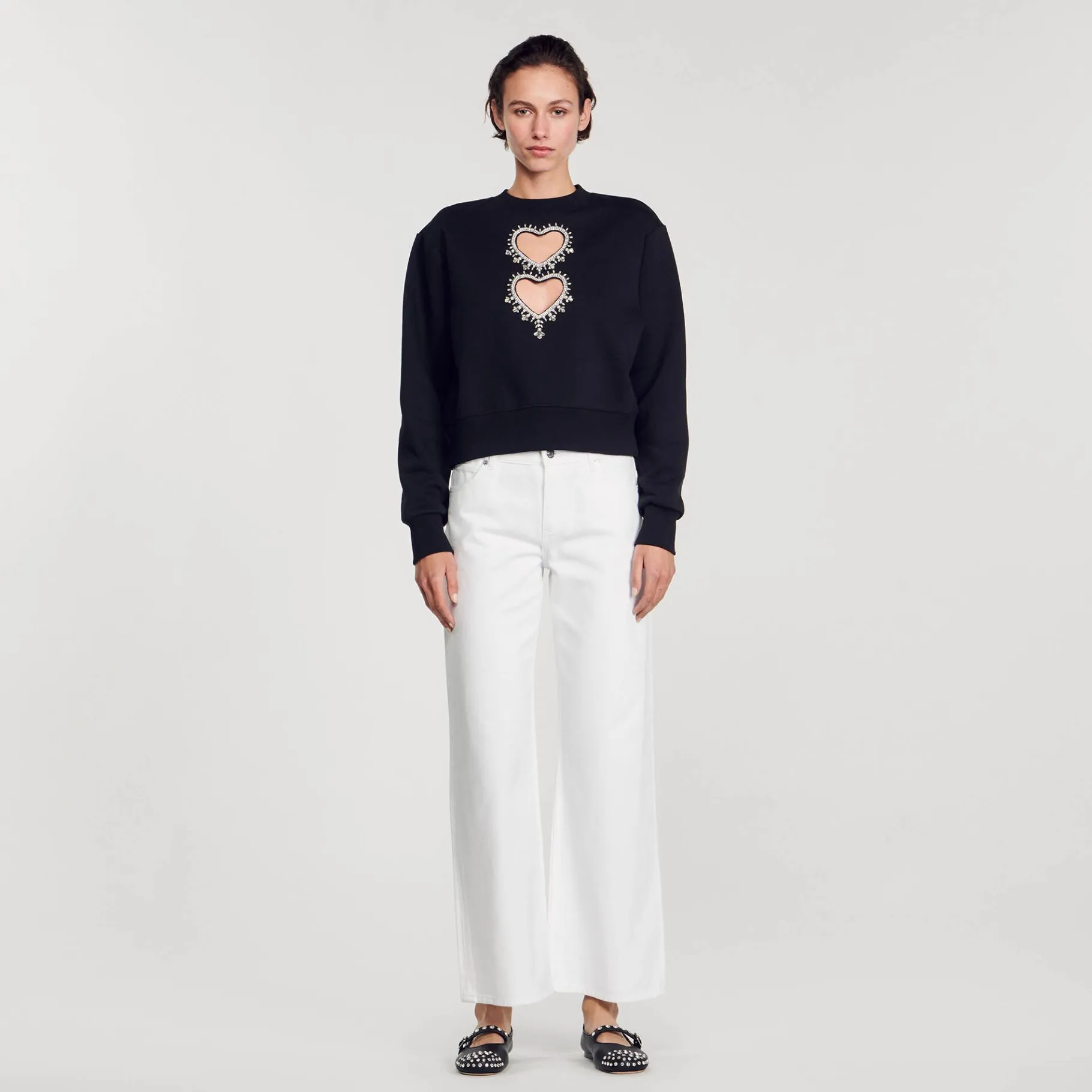 Moletom Em Jersey Com Gola Redonda E Manga Comprida, Decorado Com Recortes De Coração Com Strass.