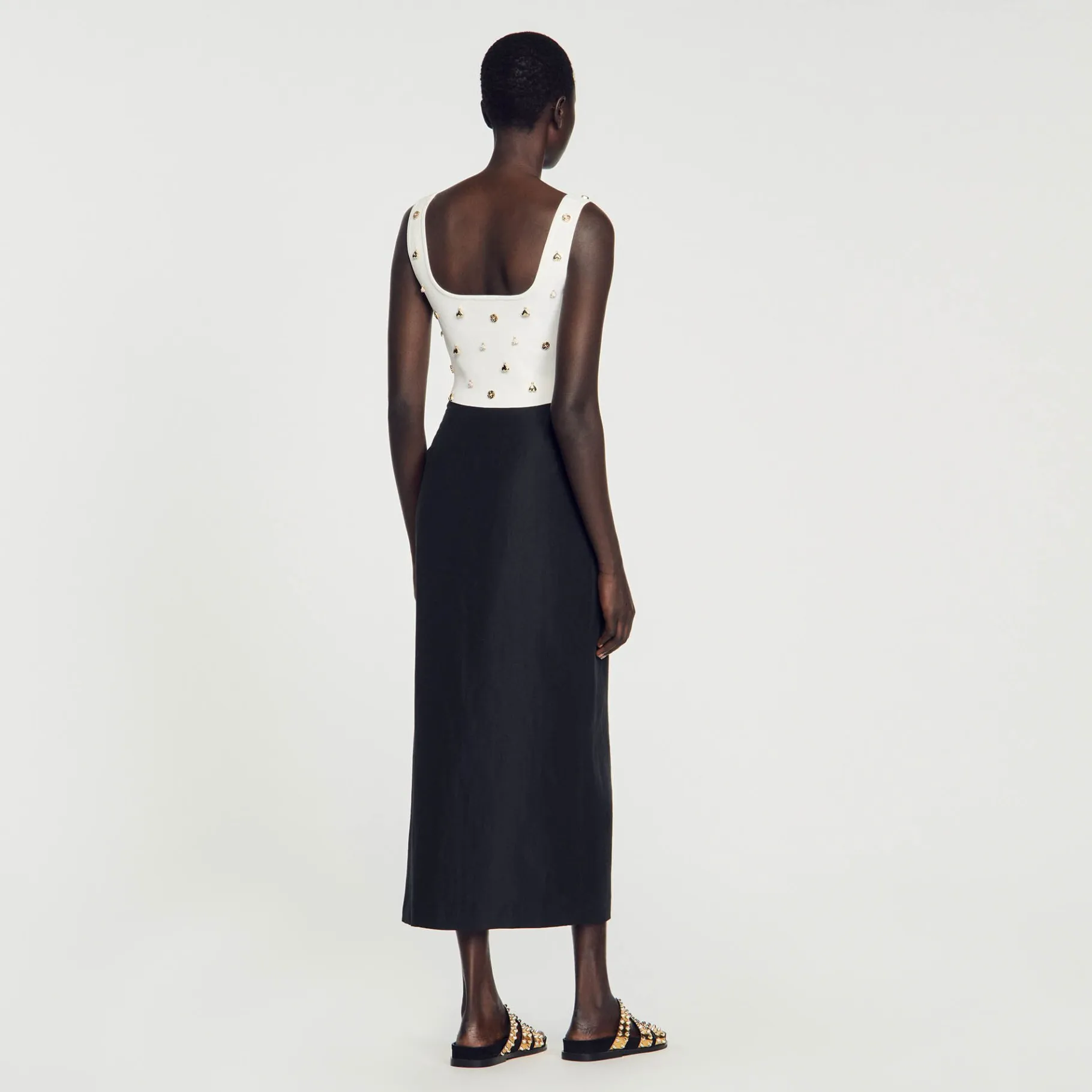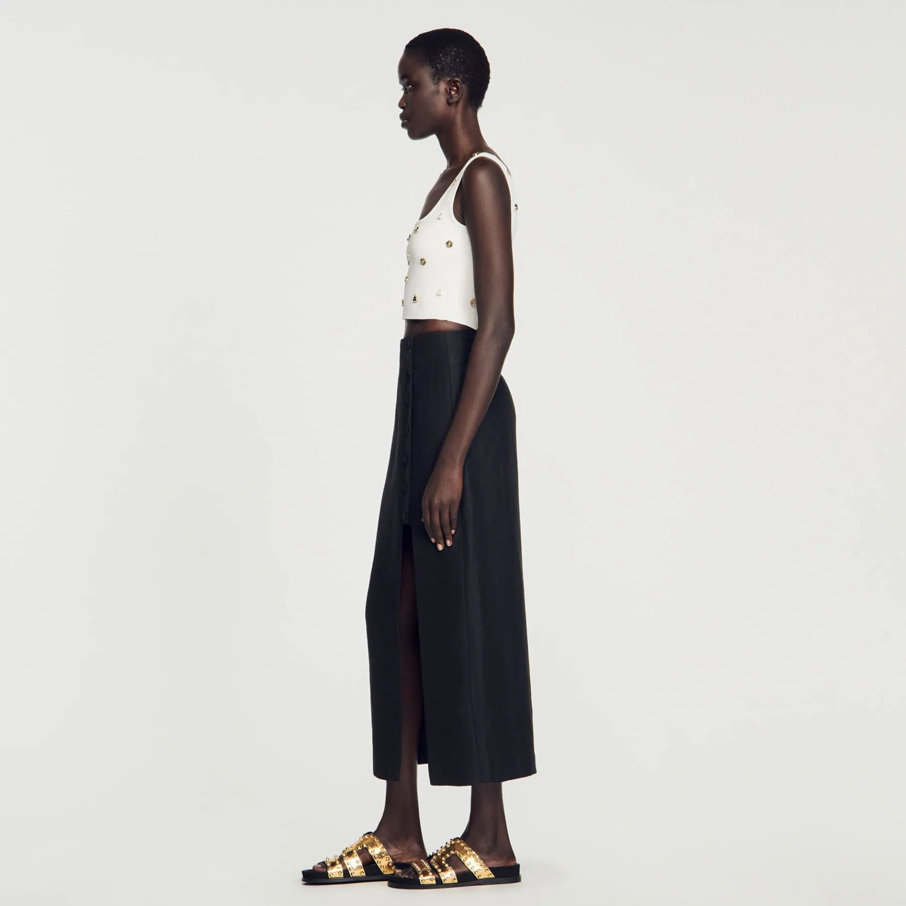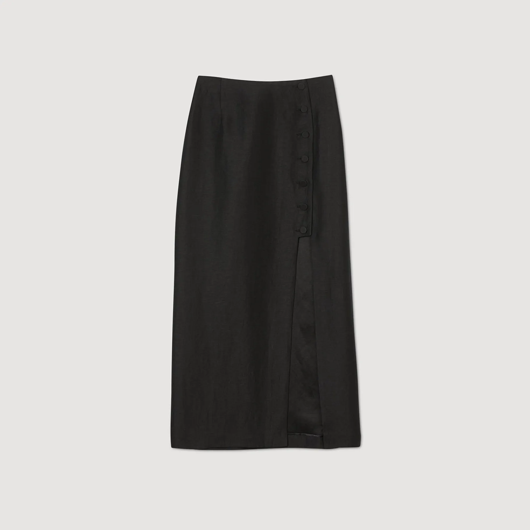 Saia Midi De Cintura Alta Com Detalhe De Botões Forrados Na Lateral E Fenda Na Barra.
