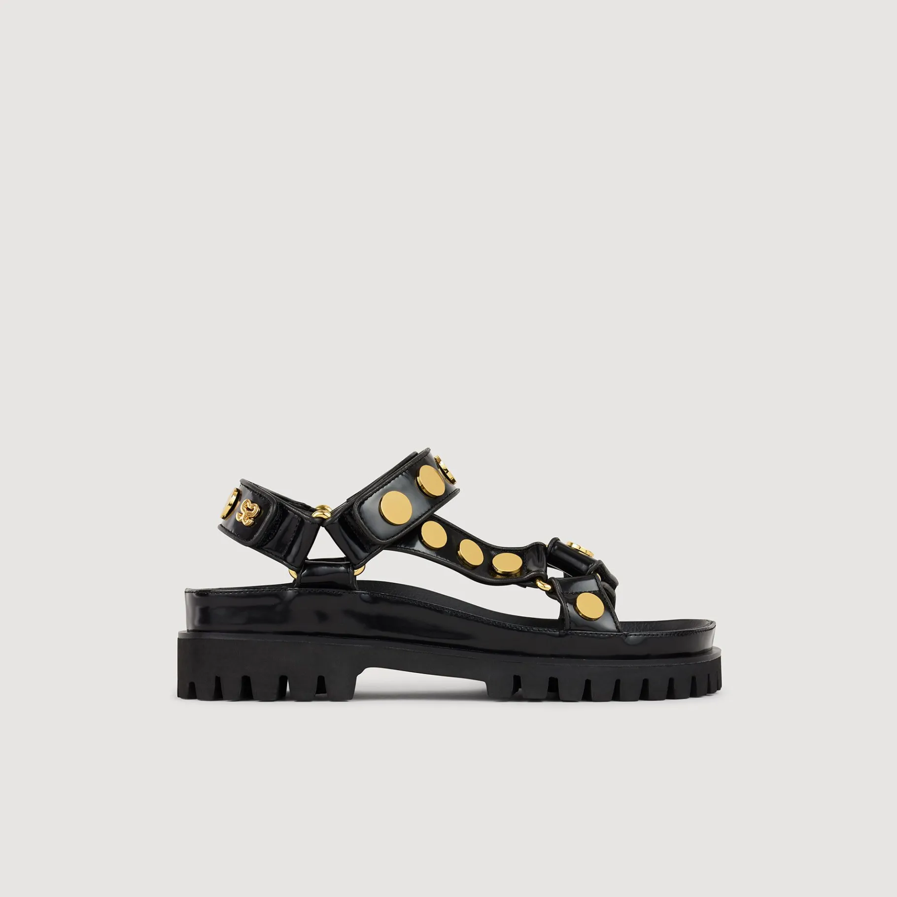Sandálias De Couro Com Sola Serrilhada E Tiras De Velcro Decoradas Com Tachas Planas Douradas.