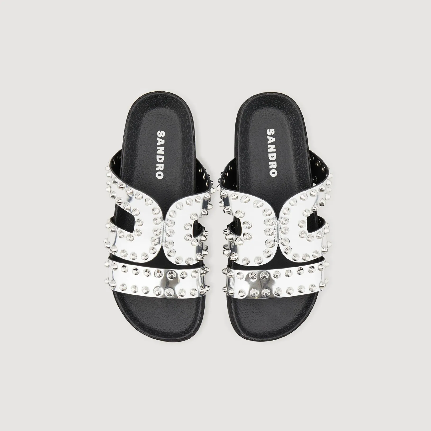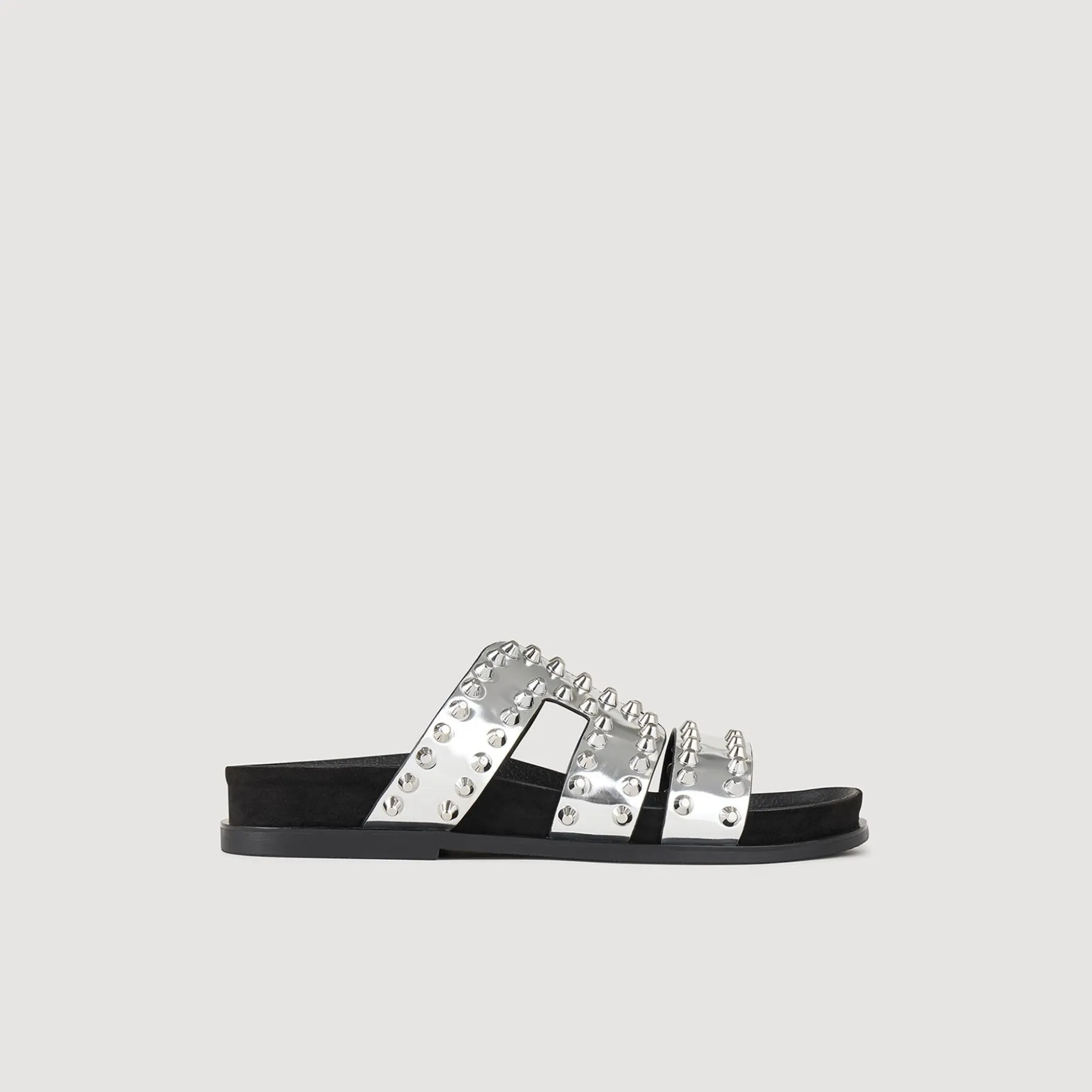 Sandálias Rasteiras Com Tiras Largas Metálicas Efeito Espelho E Detalhe De Rebites Na Ponta.