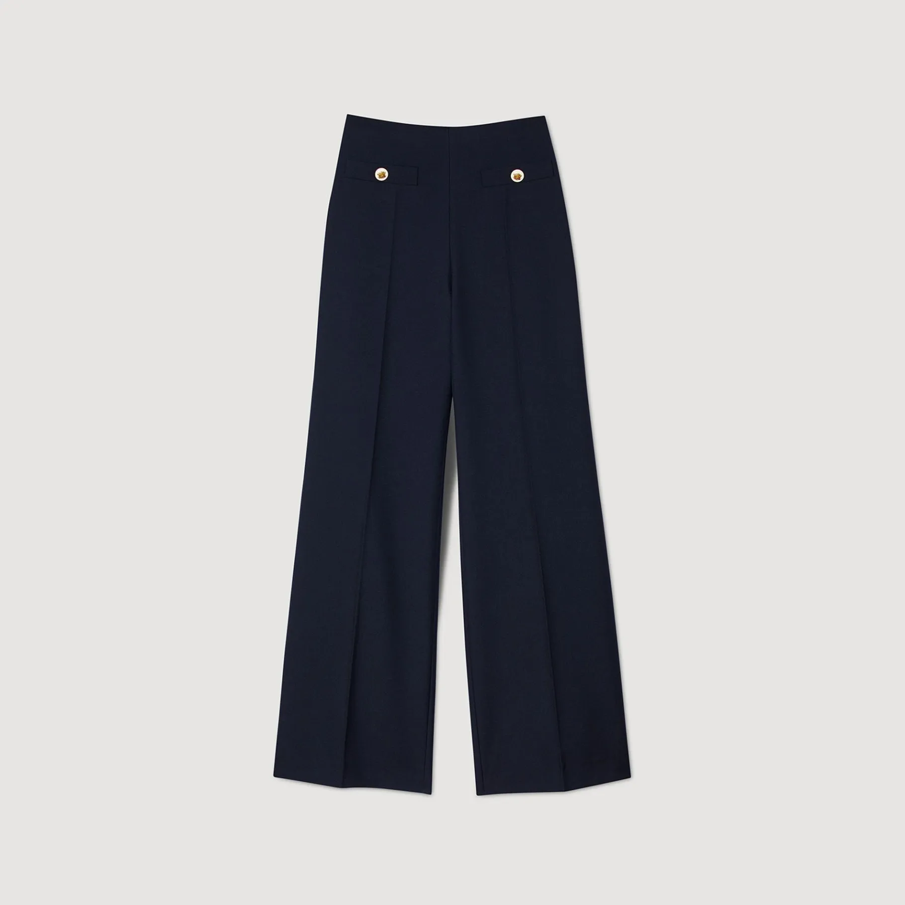 Calças De Sarja Mistura De Lã Com Cintura Alta, Calças Largas, Bolsos Largos Com Botões Elegantes Na Cintura E Pregas Marcadas Nas Pernas.