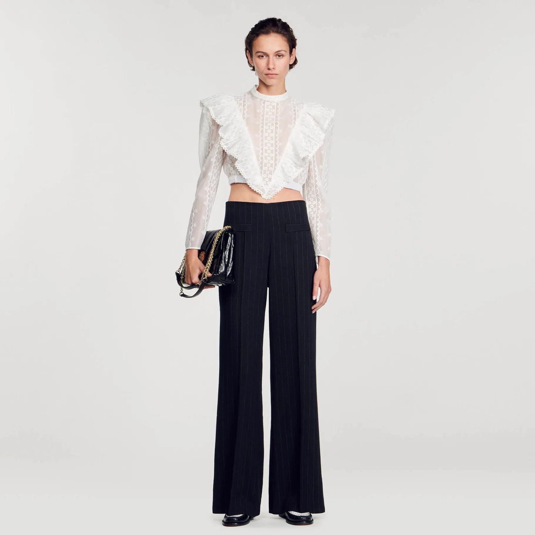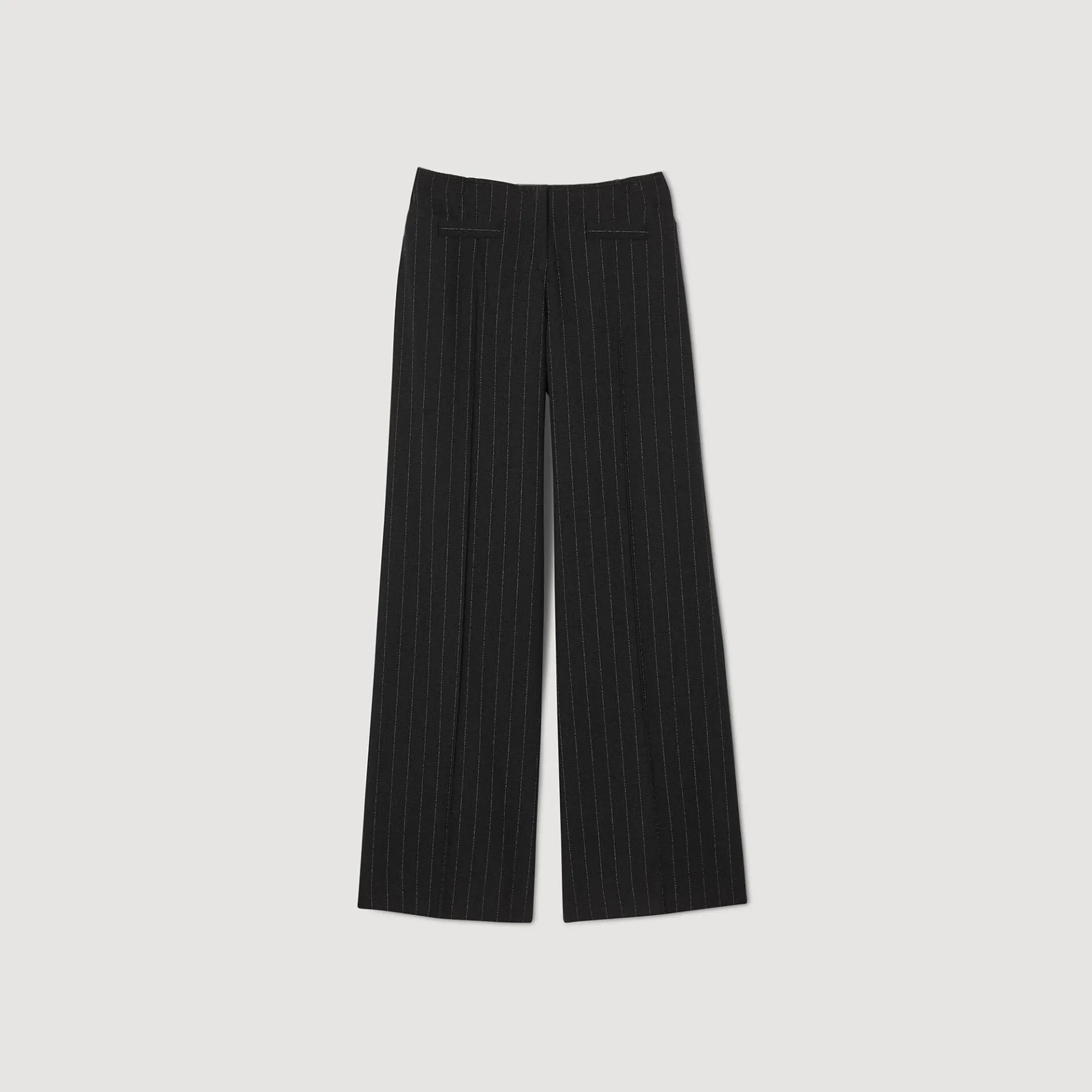 Calças Largas De Popeline Com Risca De Giz, Detalhe De Elástico Na Cintura, Bolsos Laterais E Prega Marcada Na Perna.