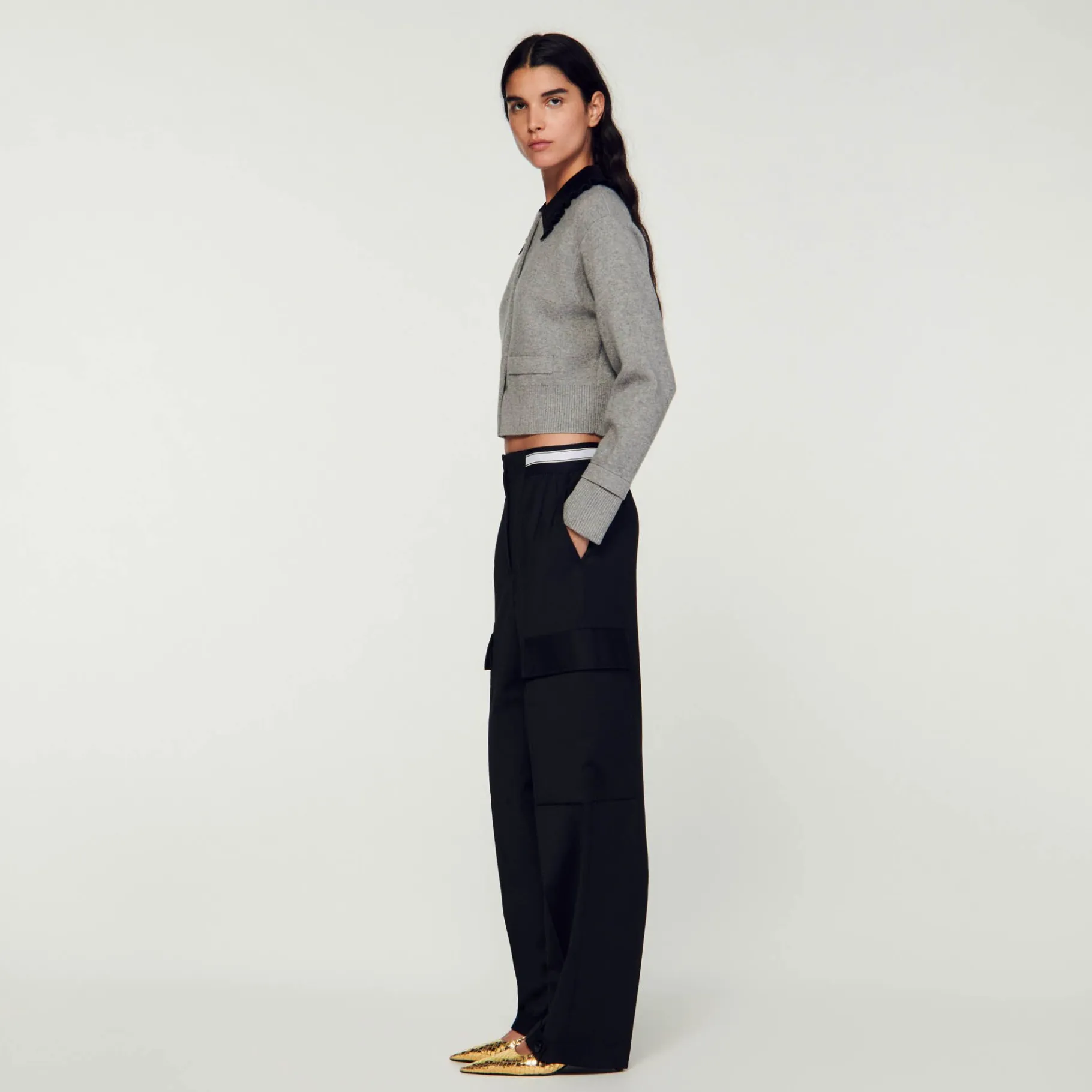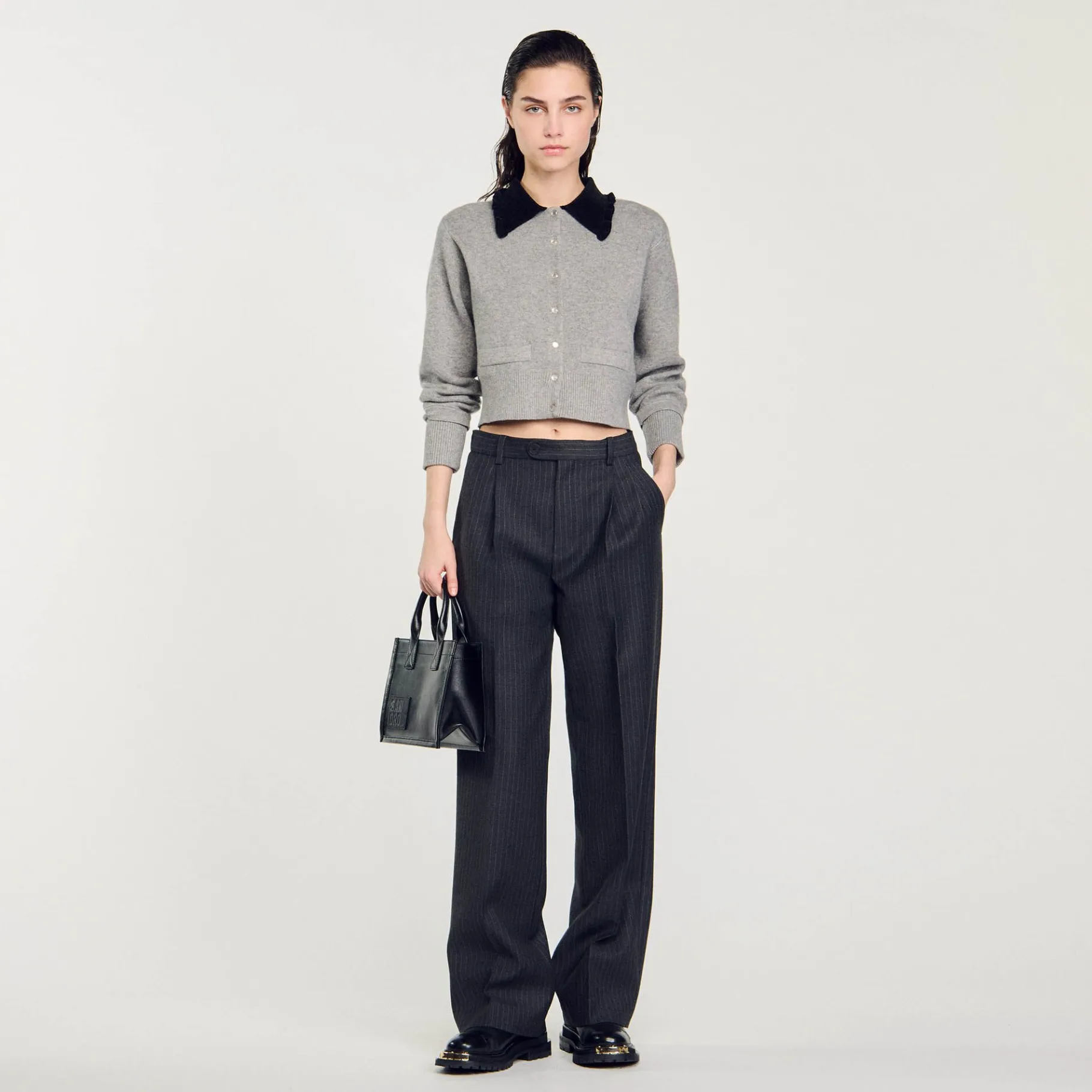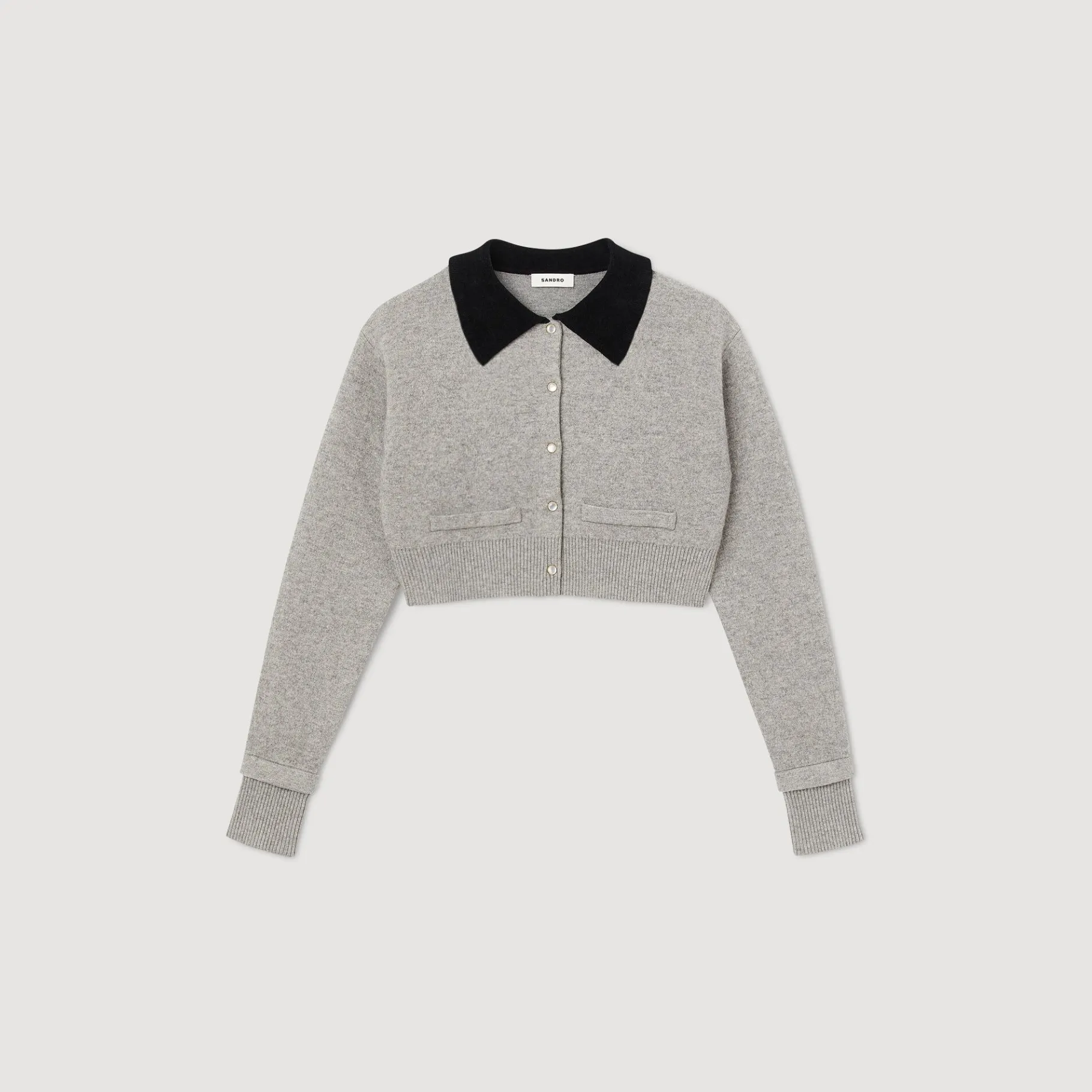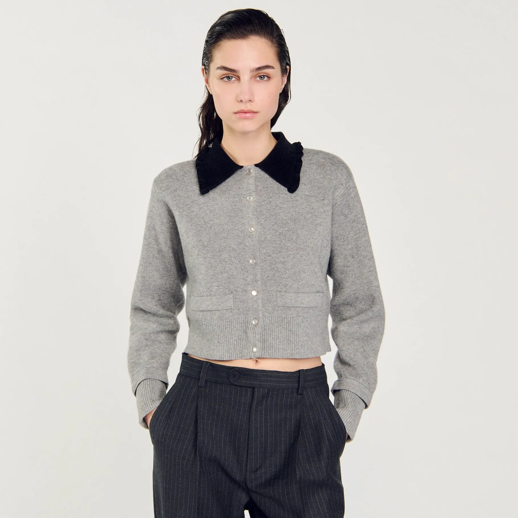 Cardigã Curto Estilo Camisa Com Mangas Compridas E Gola De Veludo Contrastante, Com Fecho De Botão.