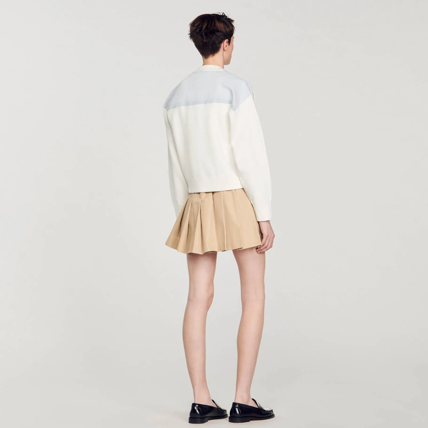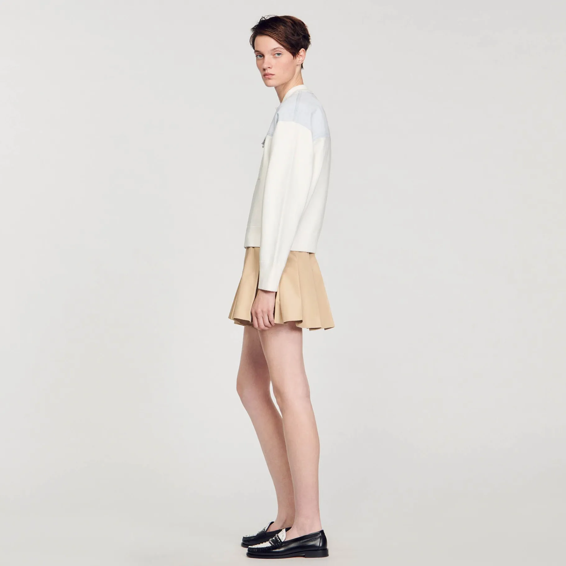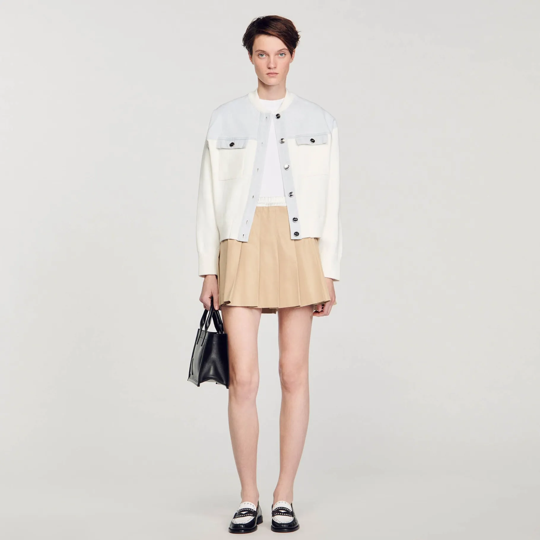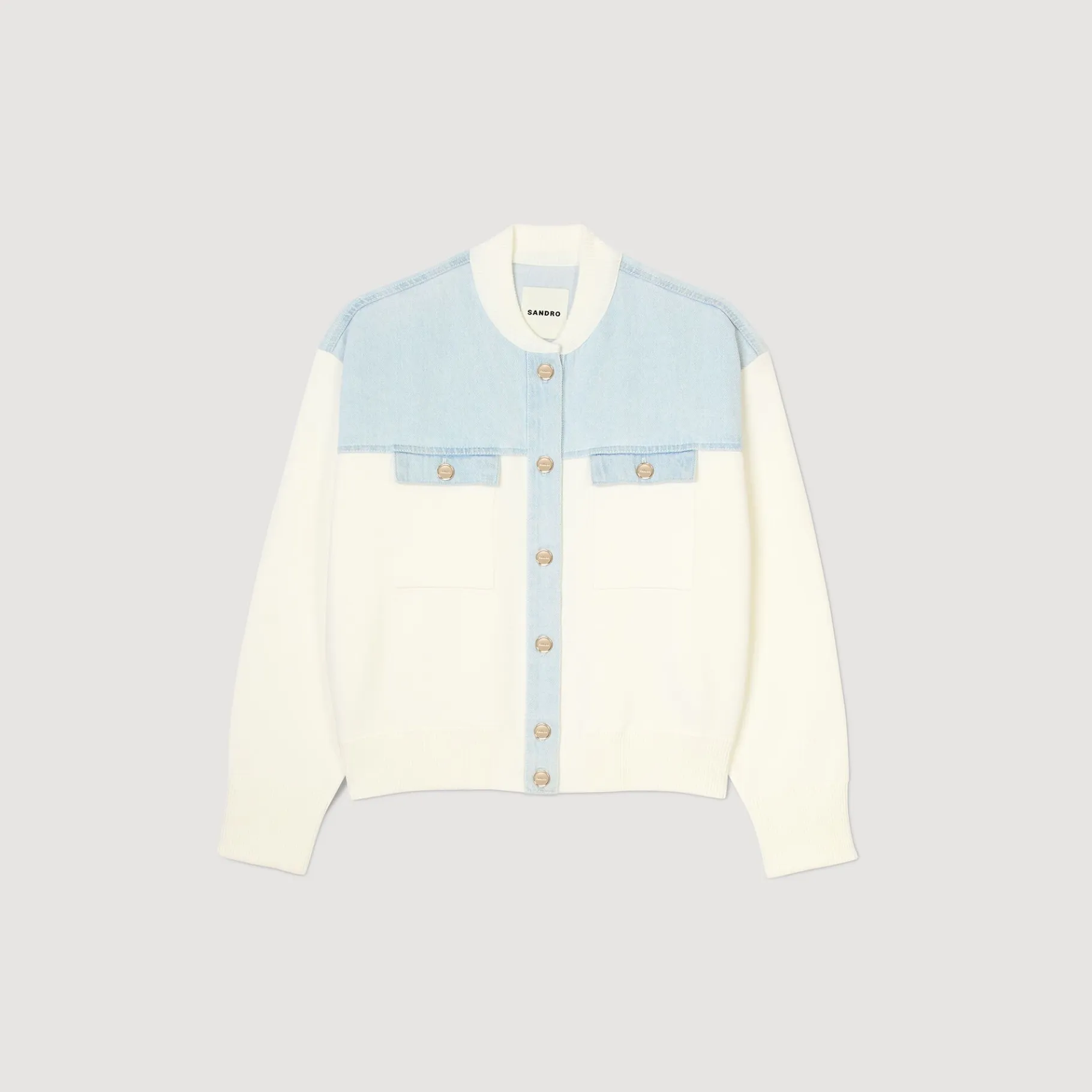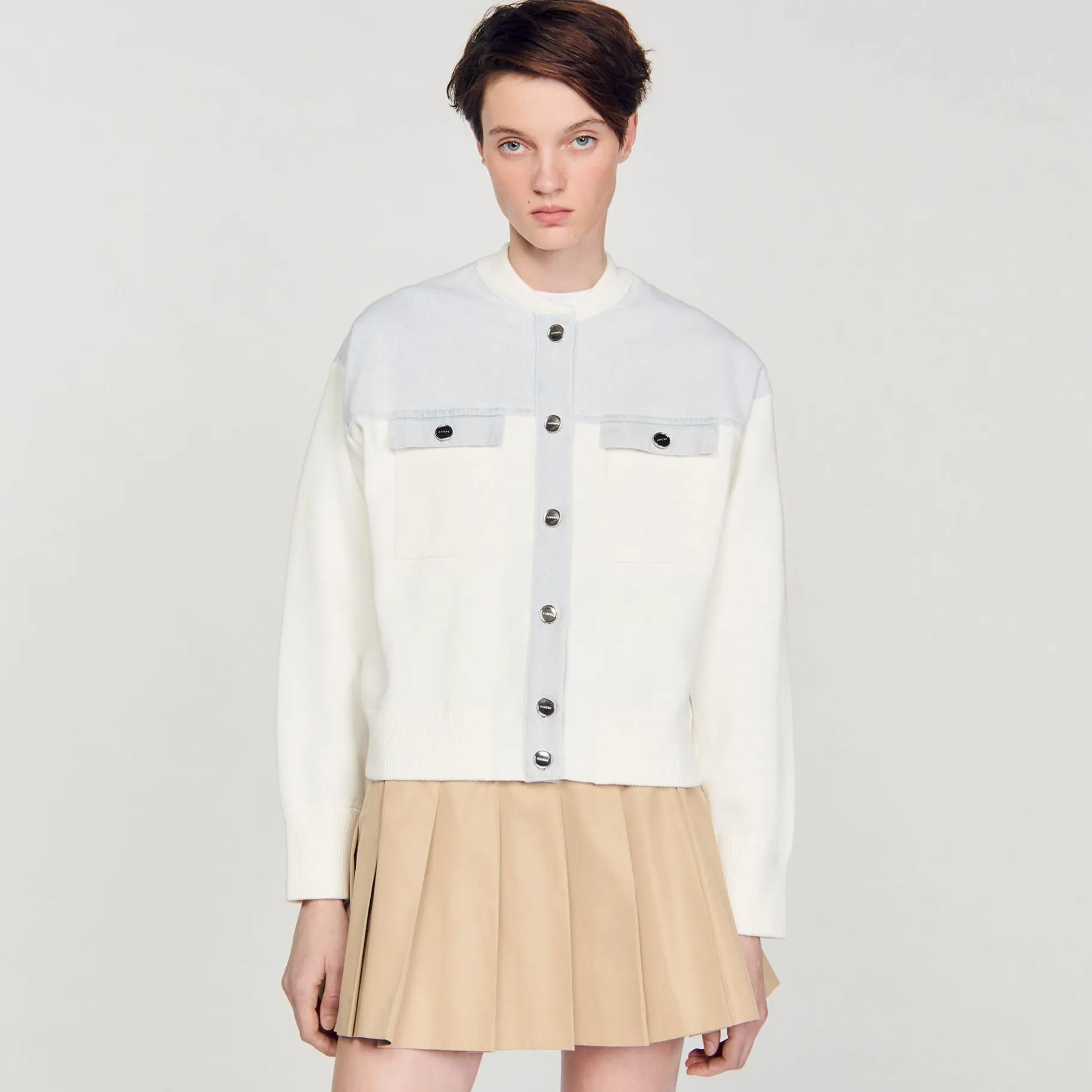 Casaco Estilo Casaco De Basebol Bimaterial Com Gola Redonda, Manga Comprida, Fecho De Botão, Bolsos De Aplicação Com Aba No Peito E Decorado Com Inserções De Ganga Nos Ombros Com Costuras Contrastantes.