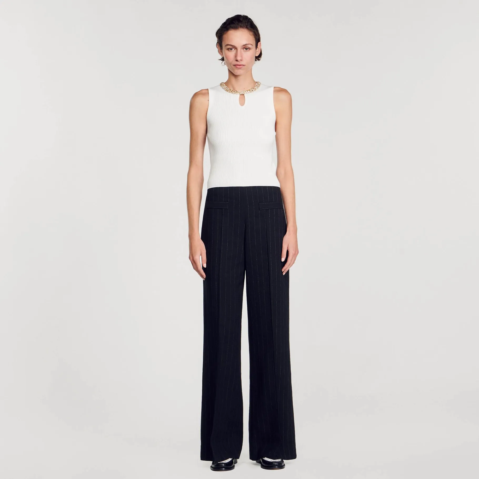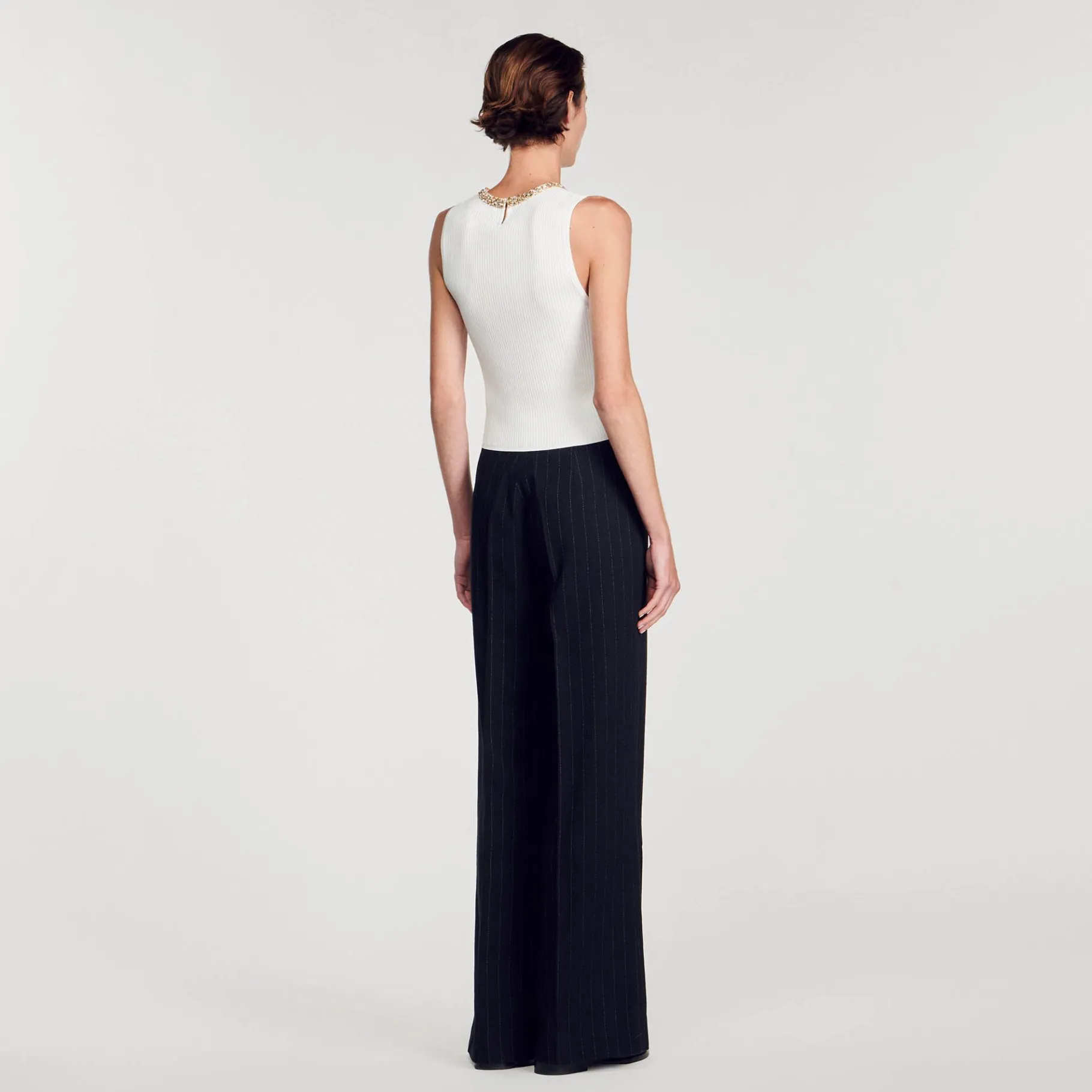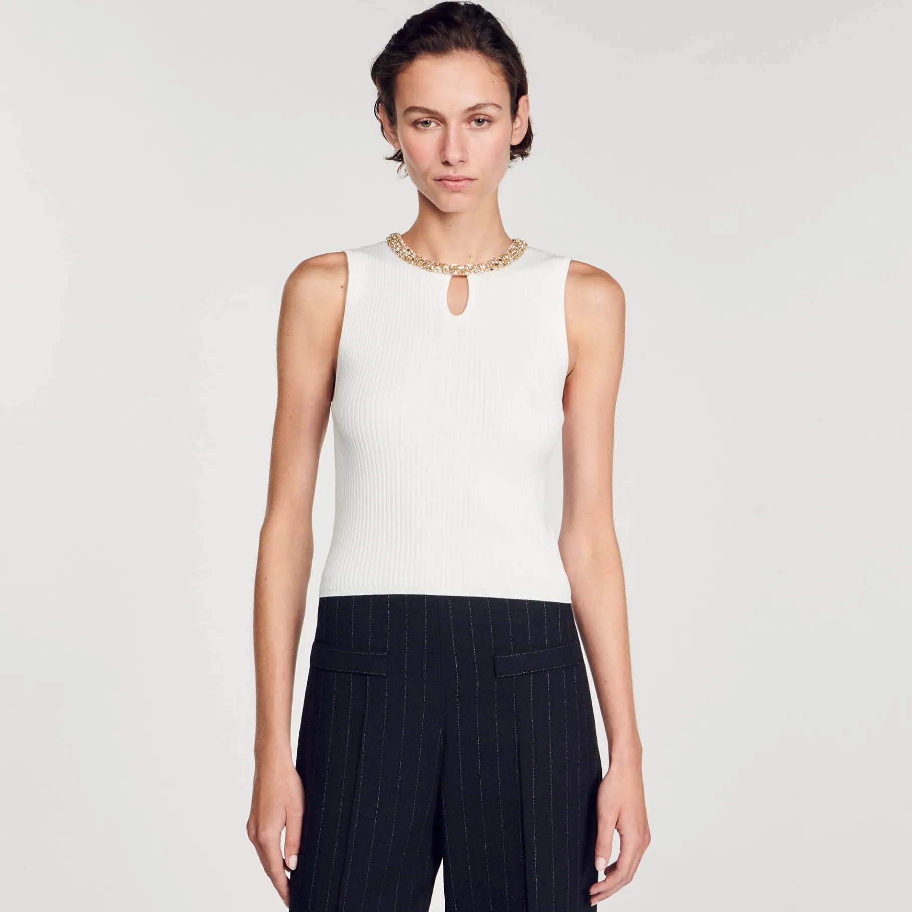 T-Shirt Sem Mangas Em Malha Canelada Fina, Com Decote Redondo Vazado E Detalhe De Strass Em Contraste.
