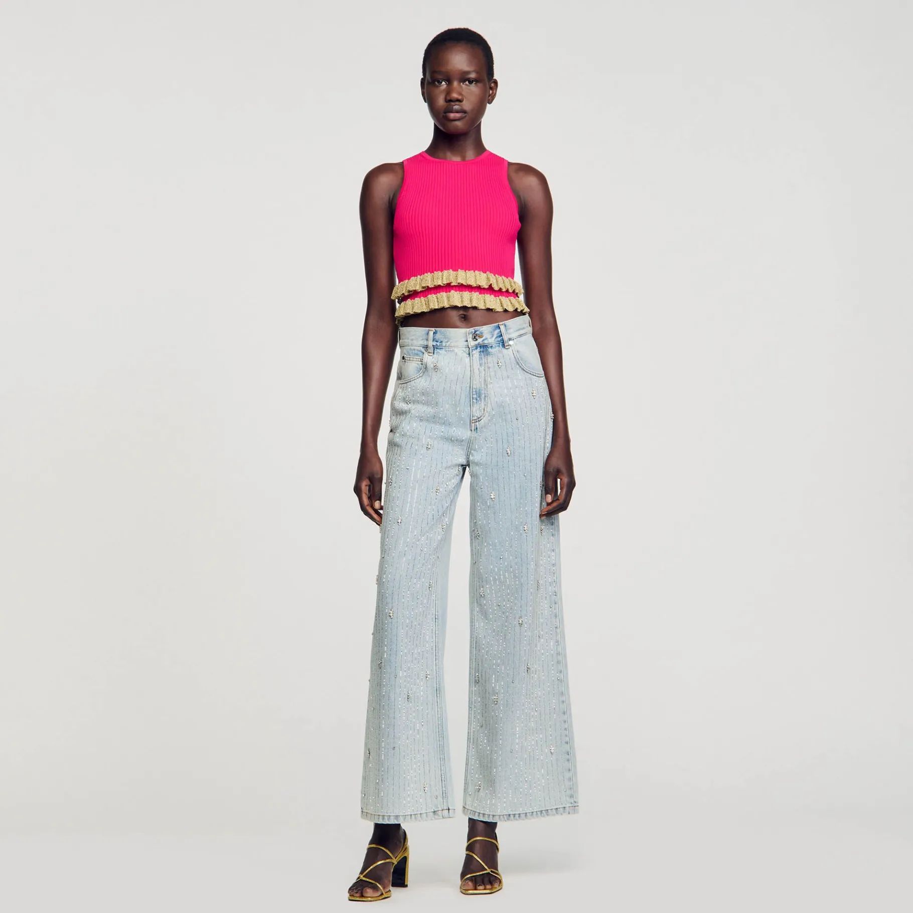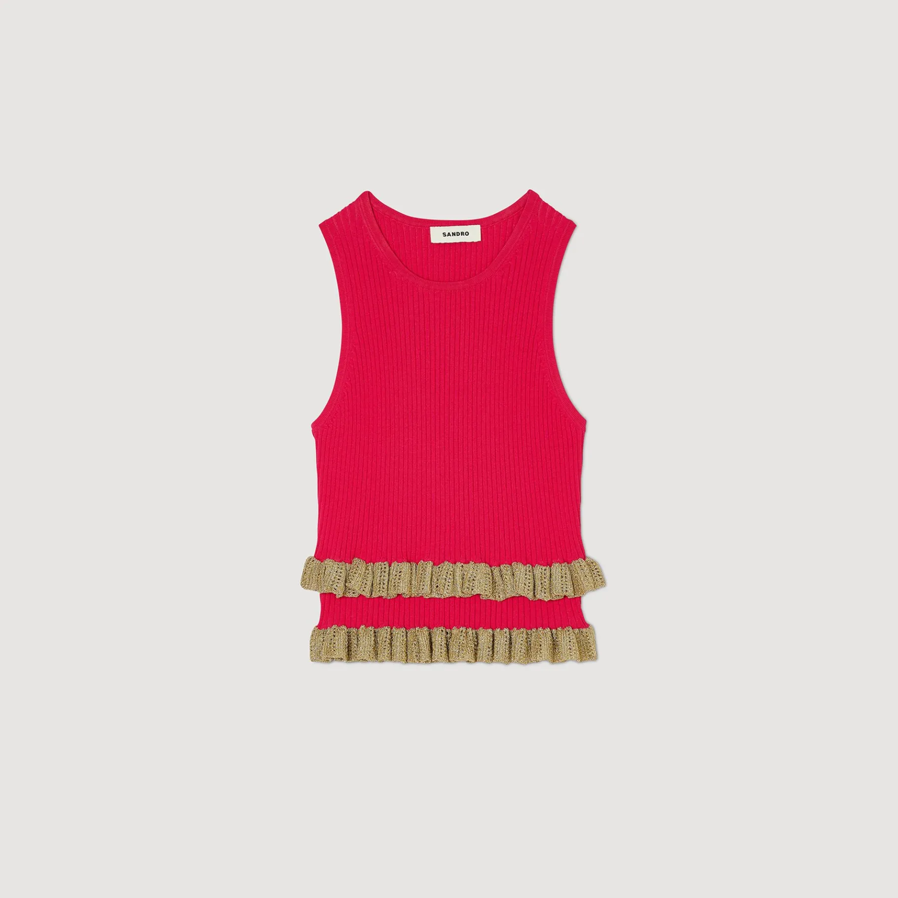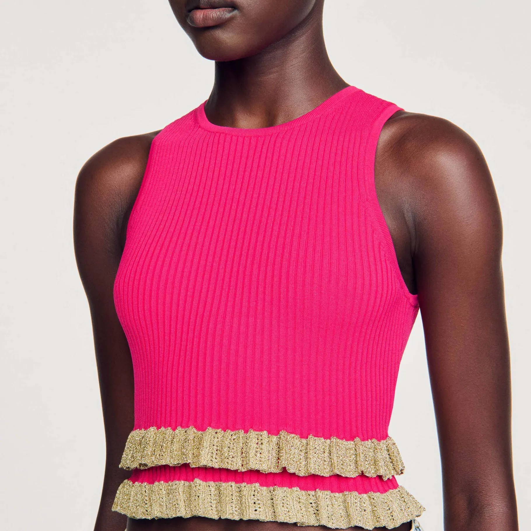 Camisola De Malha Canelada Sem Mangas Com Decote Redondo E Detalhe De Folho Em Contraste Na Bainha.
