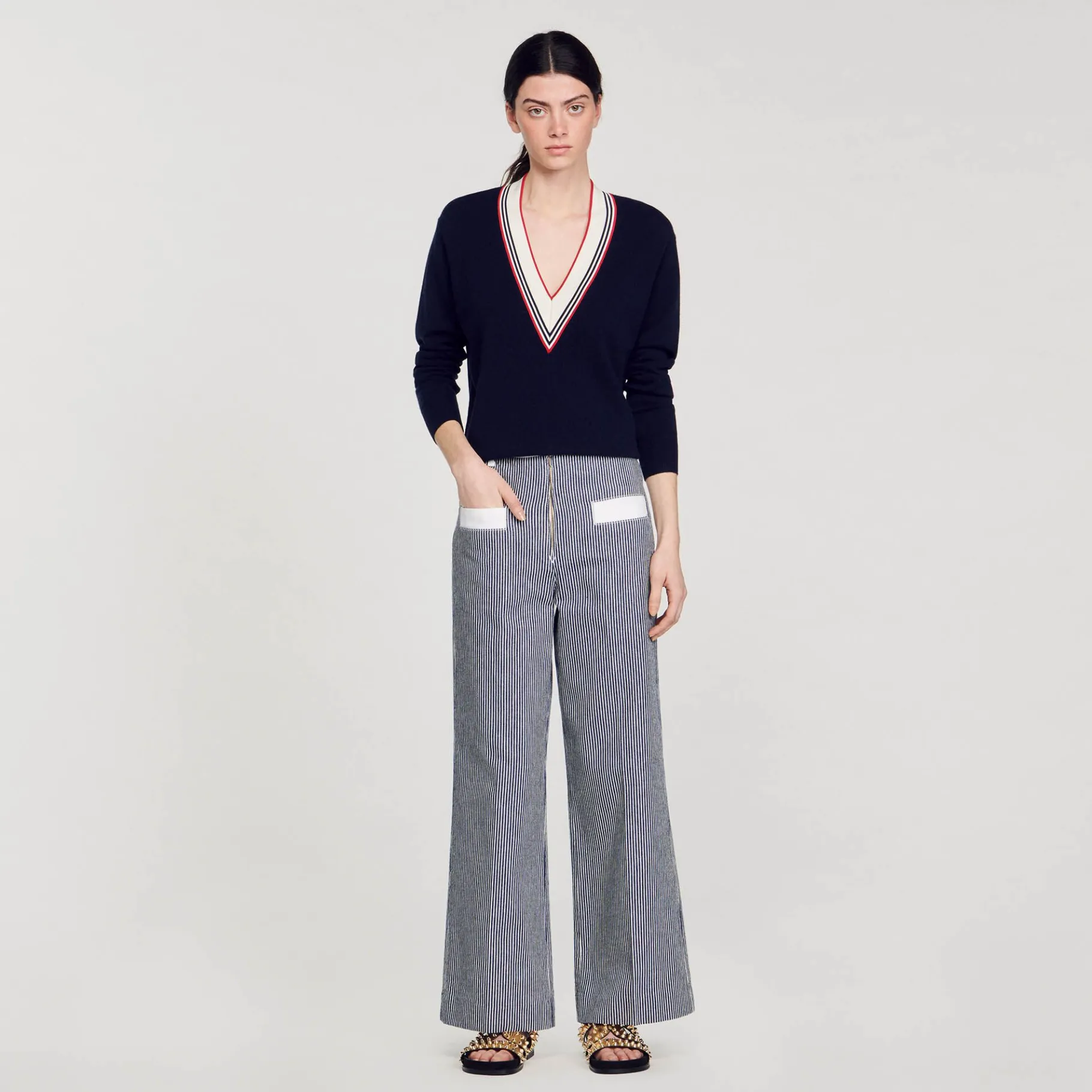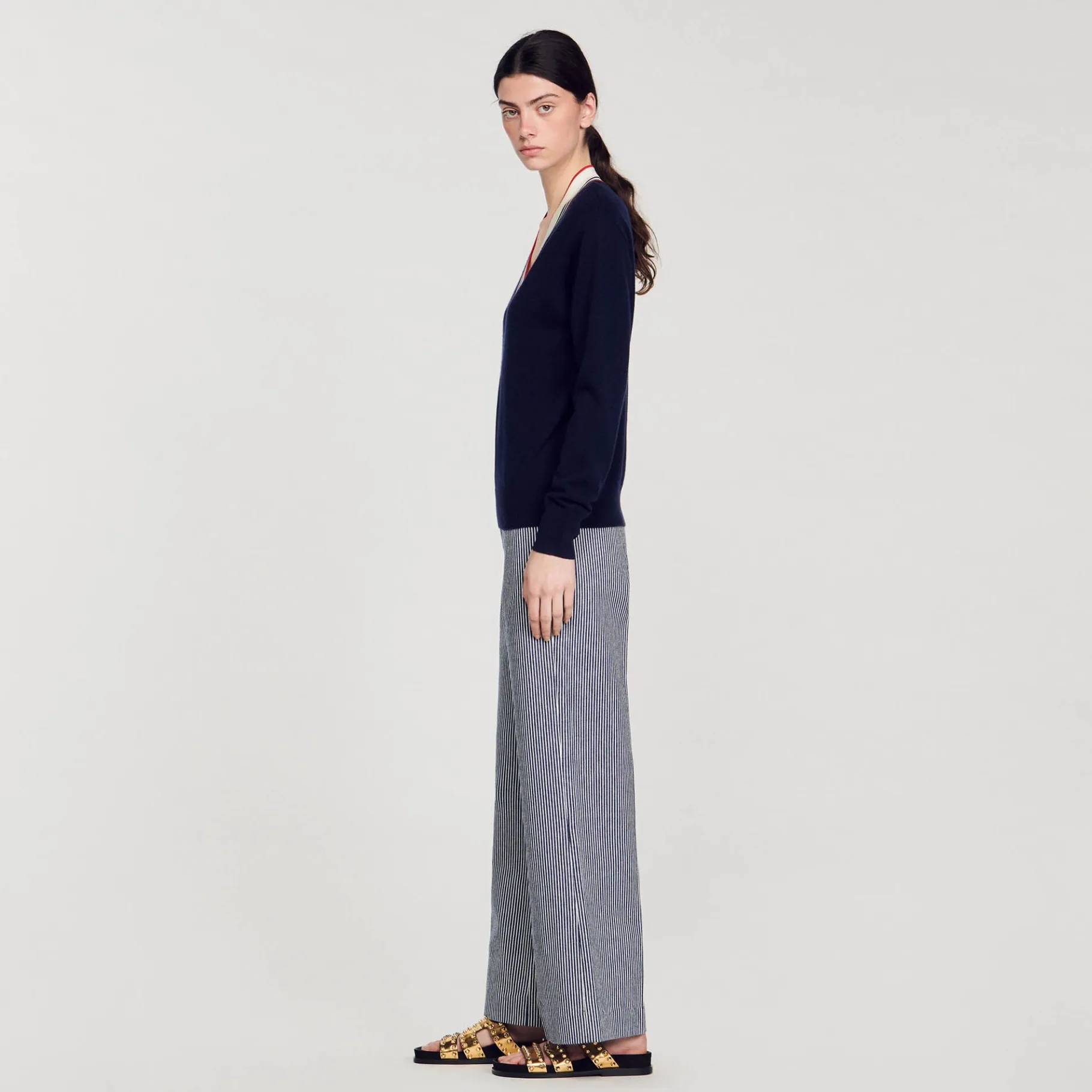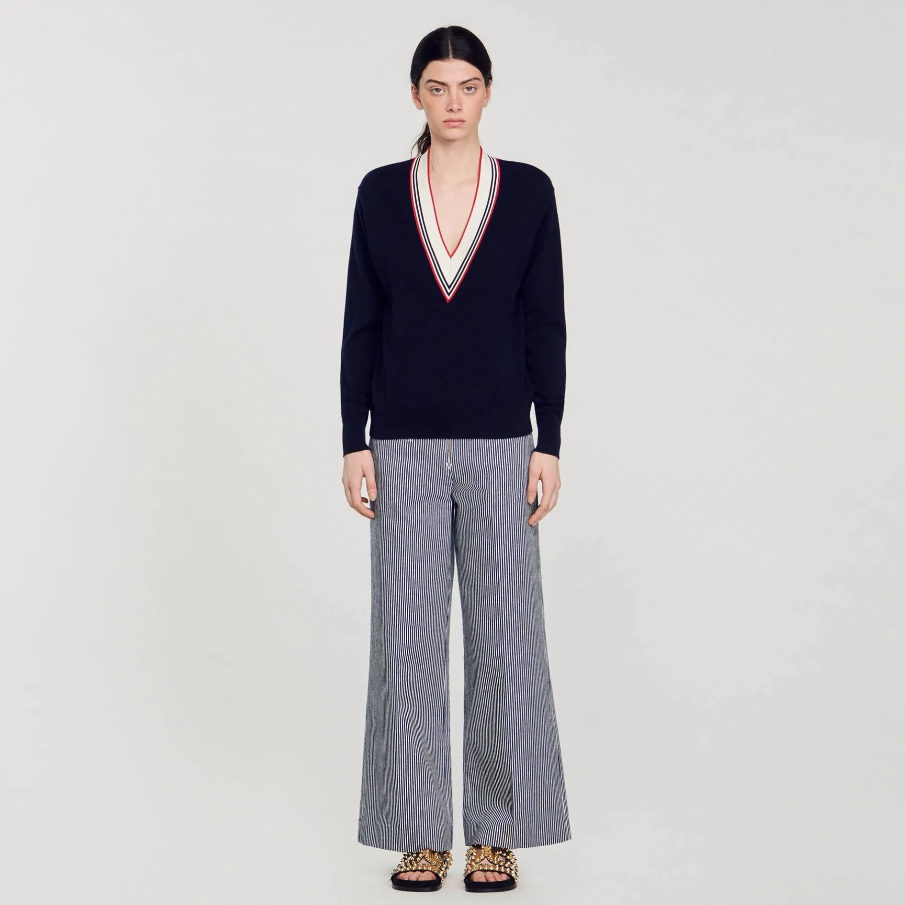 Suéter De Lã E Caxemira Com Decote Em V Listrado E Manga Comprida Decorada Com Listras No Pescoço.