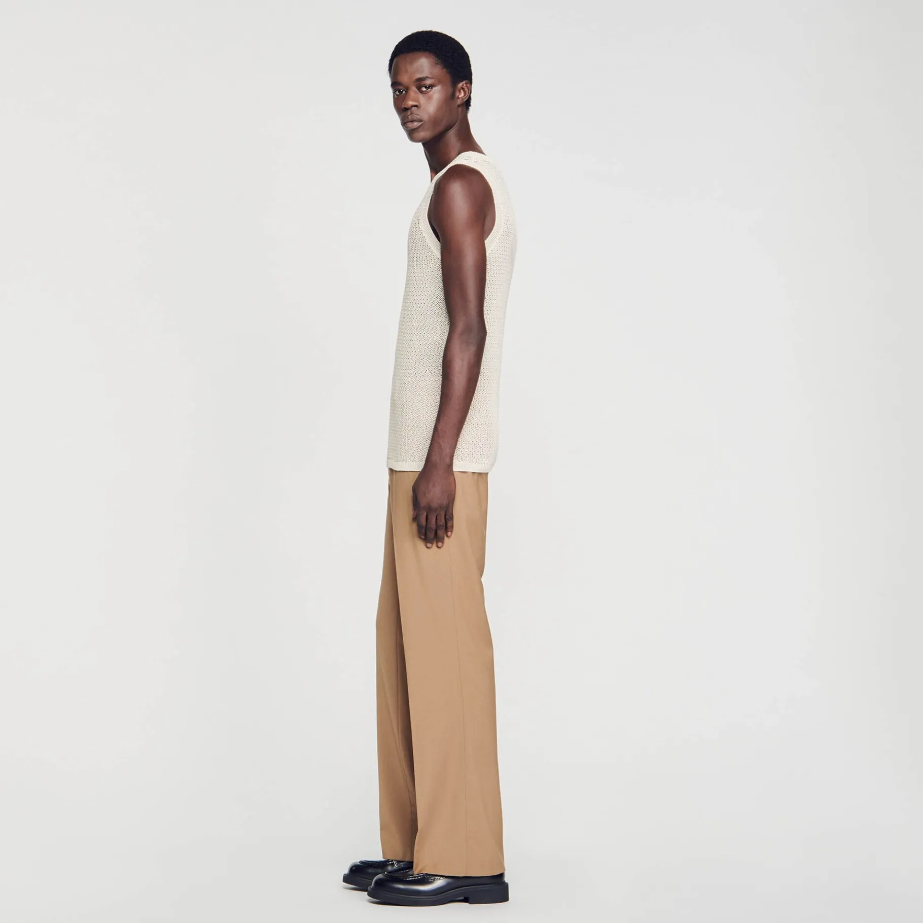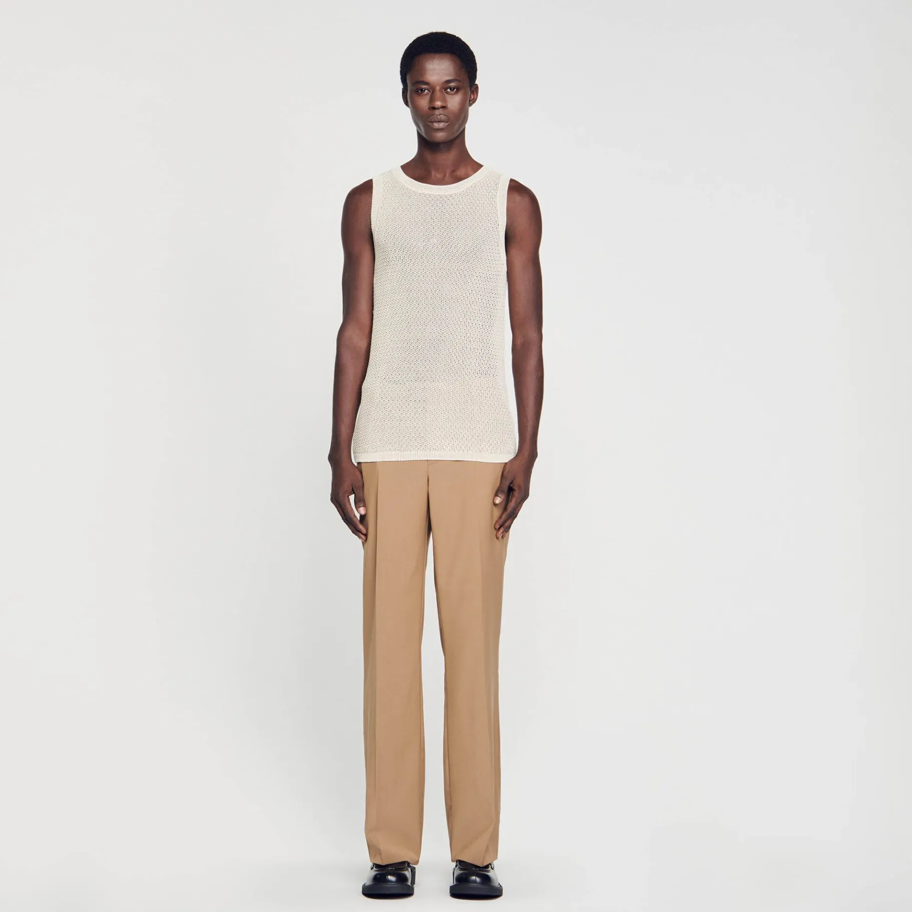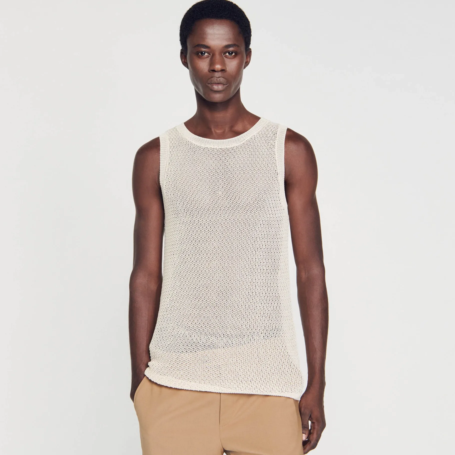 Camisola Sem Mangas Em Malha Perfurada Ligeiramente Brilhante, Com Decote Redondo E Orlas Finamente Caneladas.