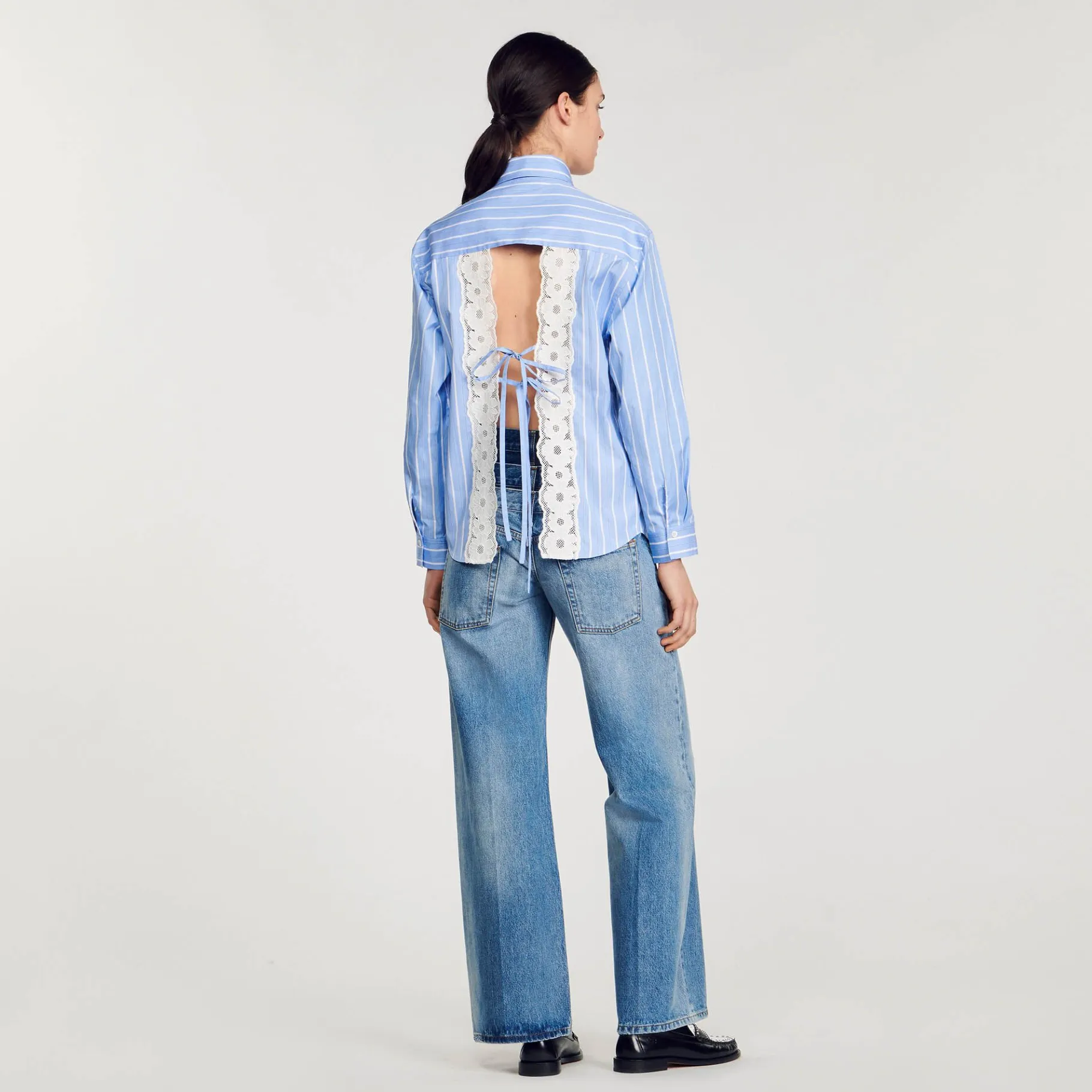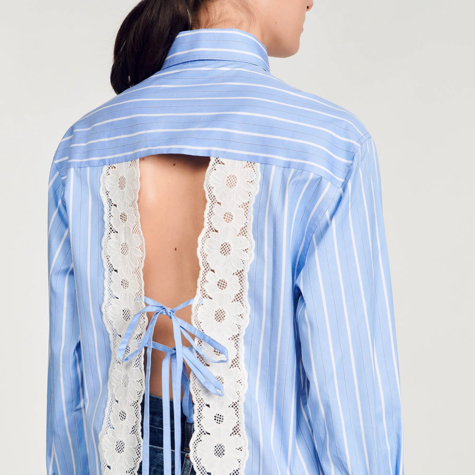 Camisa Listrada De Popeline De Algodão Com Gola, Manga Longa, Fecho De Botão, Costas Abertas E Detalhe De Listras Em Renda E Fitas Para Amarrar.