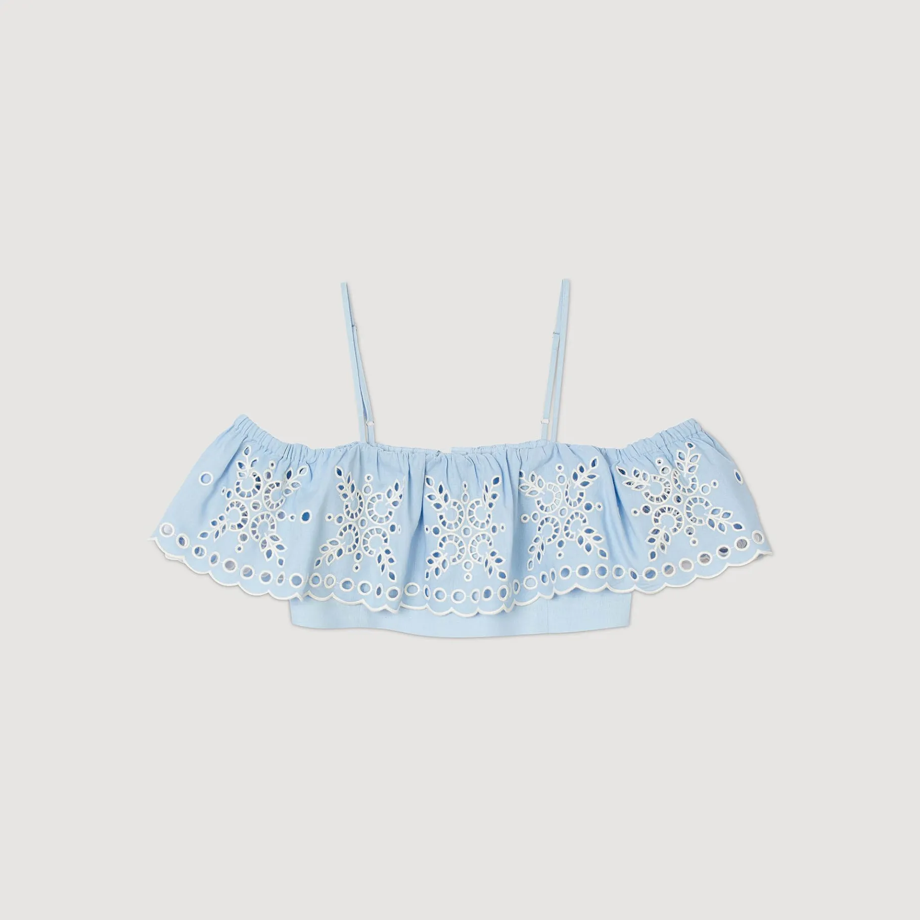 Top Cropped Com Alças Finas Ajustáveis, Babado Nos Ombros E Bordado Inglês Contrastante.