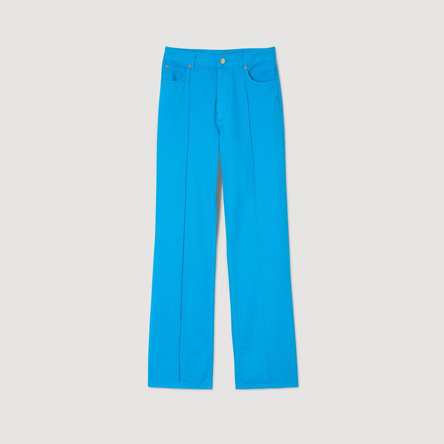 Jeans Com Pregas Marcadas Na Perna, Passantes Para Cinto Na Cintura E Cinco Bolsos.