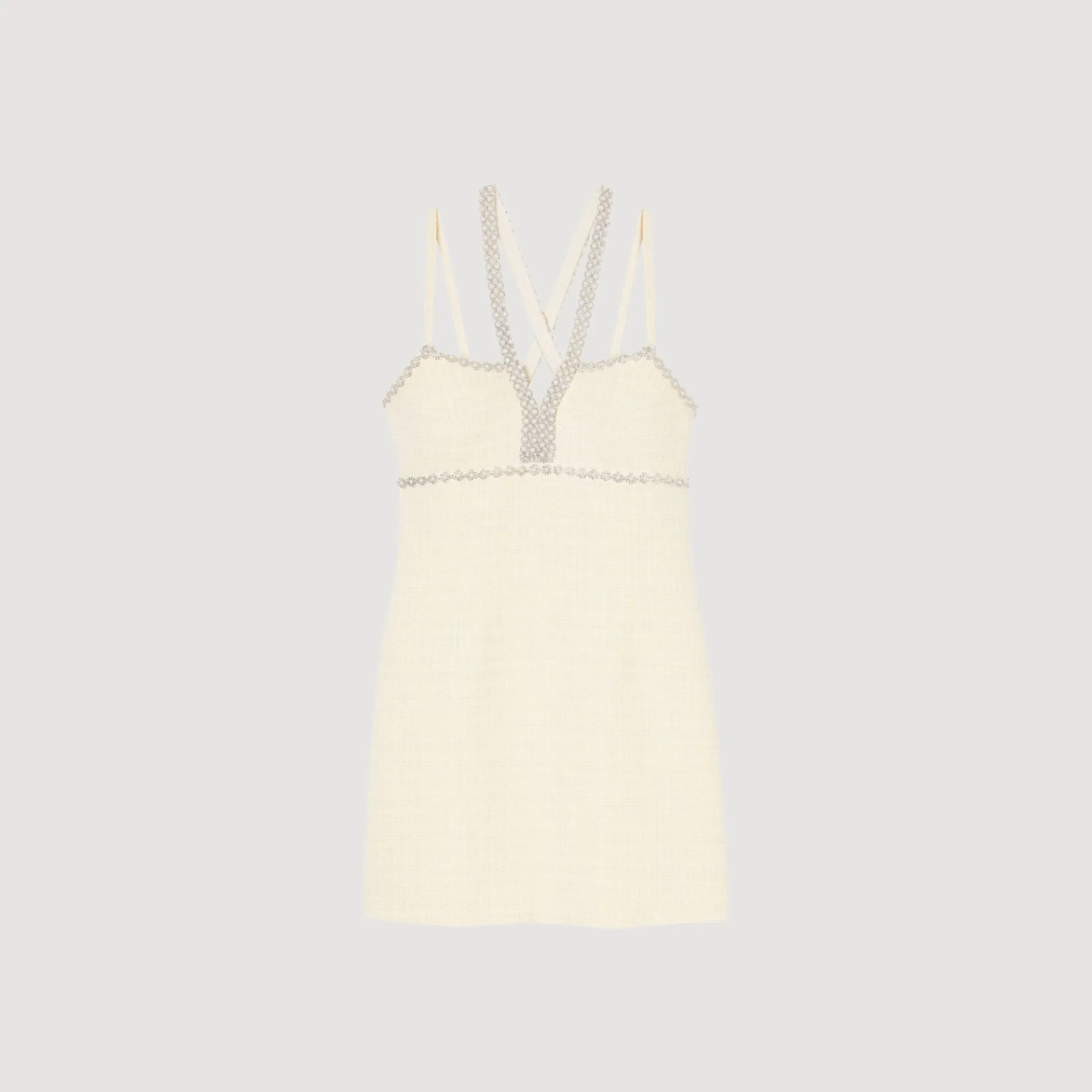 Vestido Curto De Tweed Liso, Com Alças Duplas Cruzadas Nas Costas E Detalhe De Pérolas No Peito.