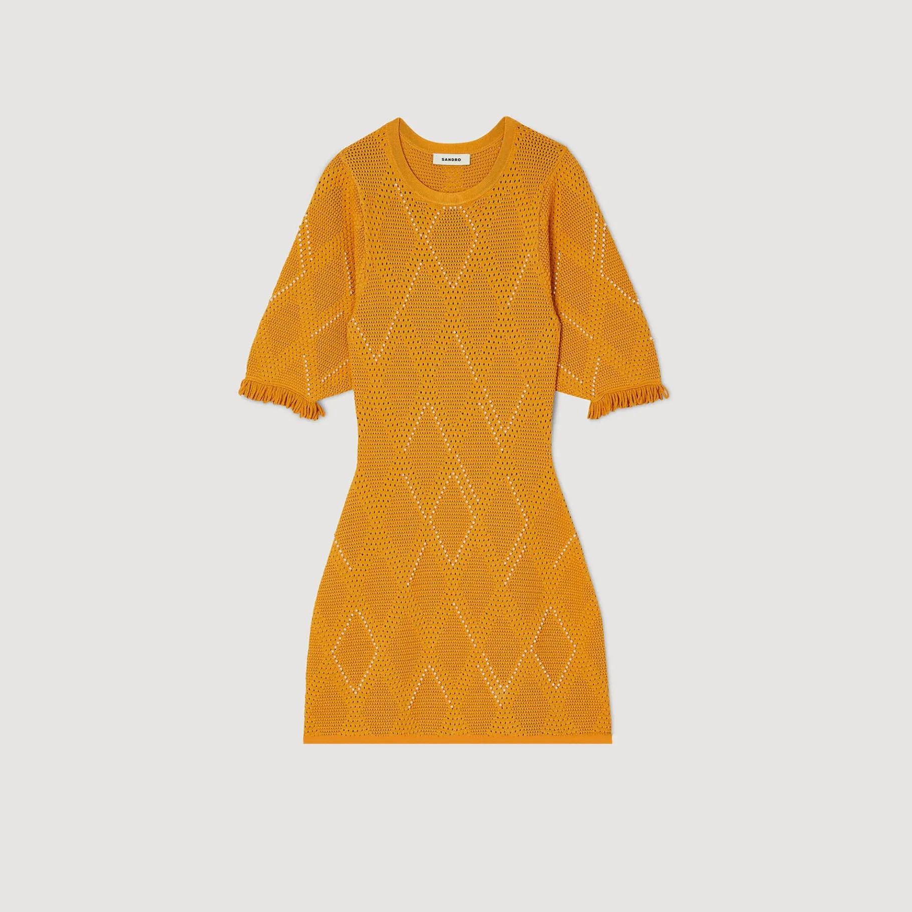 Vestido Curto Em Malha Texturizada Com Estampa De Diamantes Decorado Com Pérolas, Decote Redondo E Manga Curta Com Franjas.