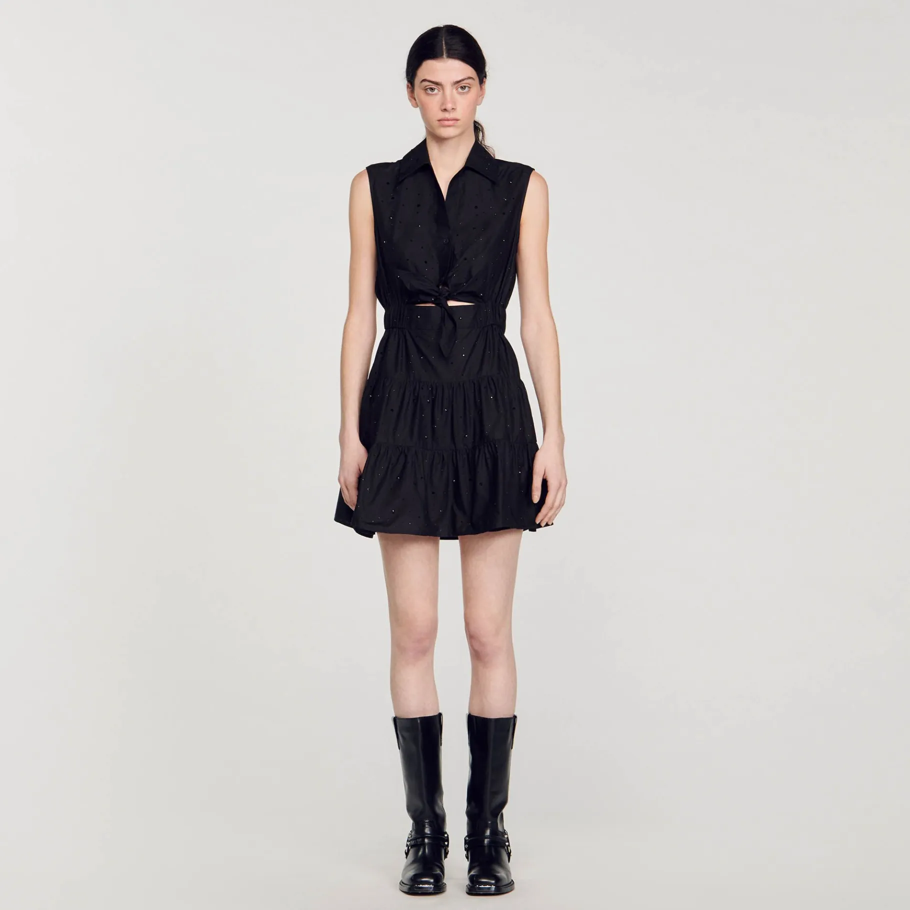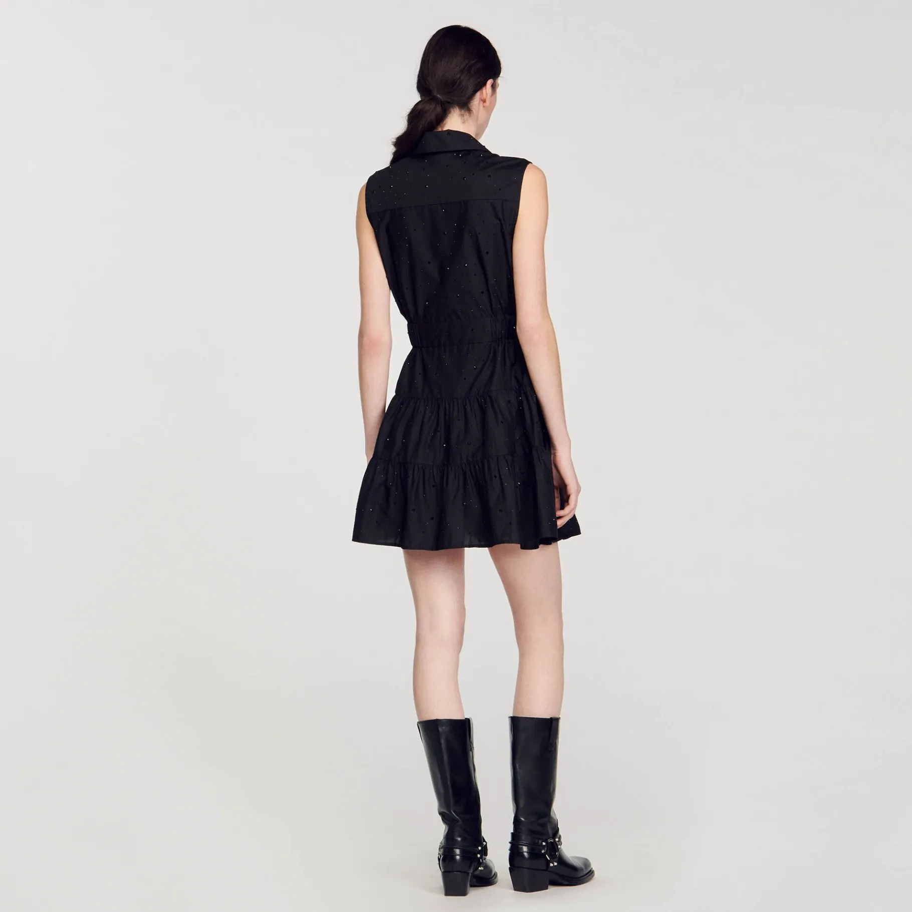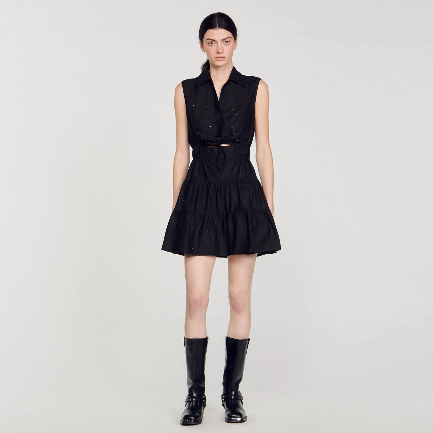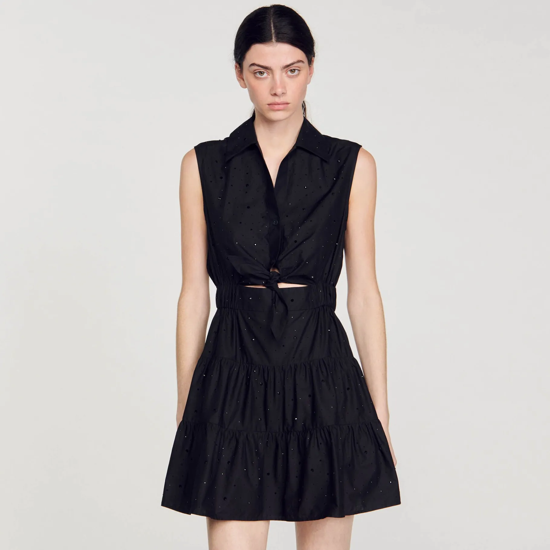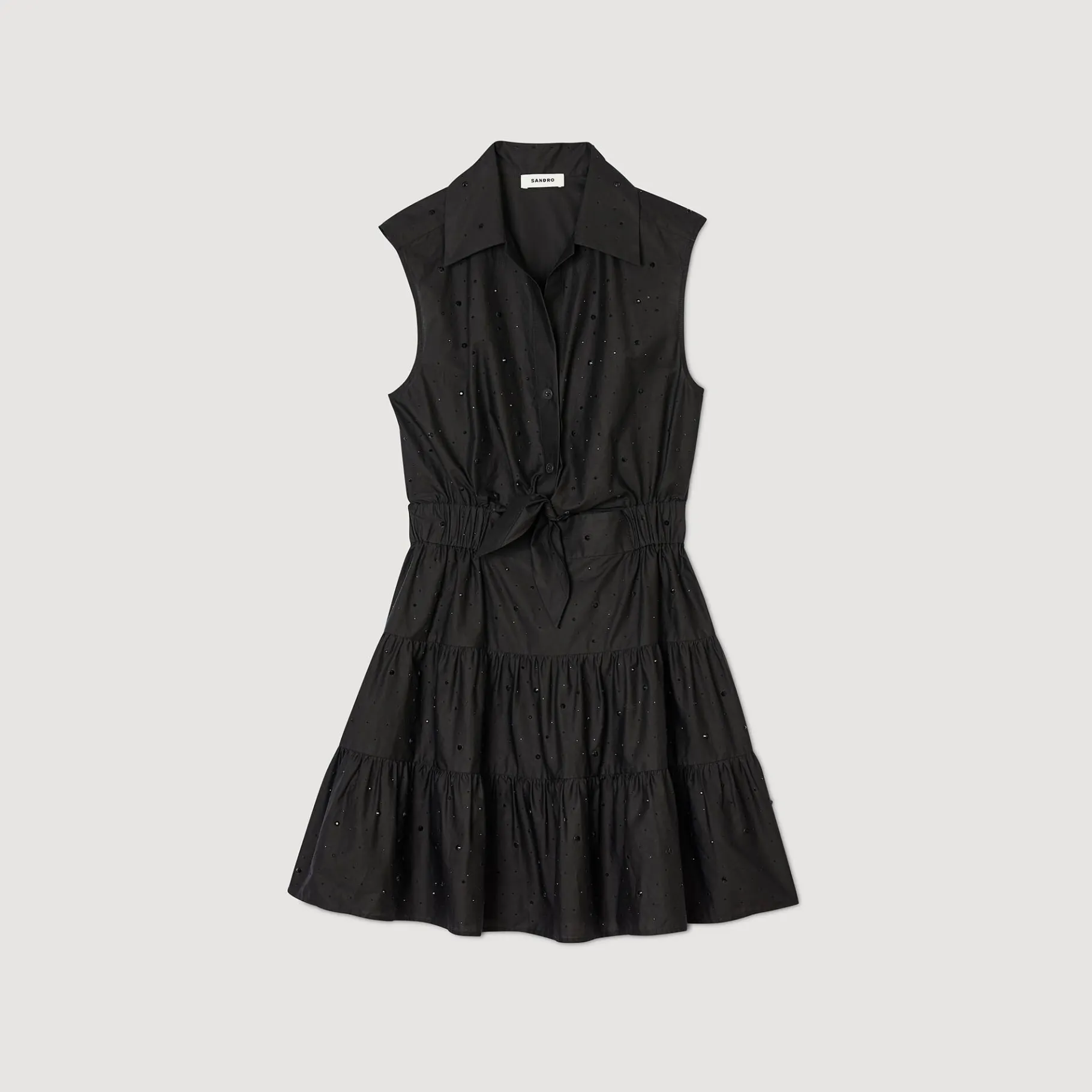 Vestido Curto Sem Mangas Decorado Com Strass Tom Sobre Tom, Gola De Camisa Abotoada, Cauda Para Amarrar Na Frente, Cintura Franzida E Saia Larga.