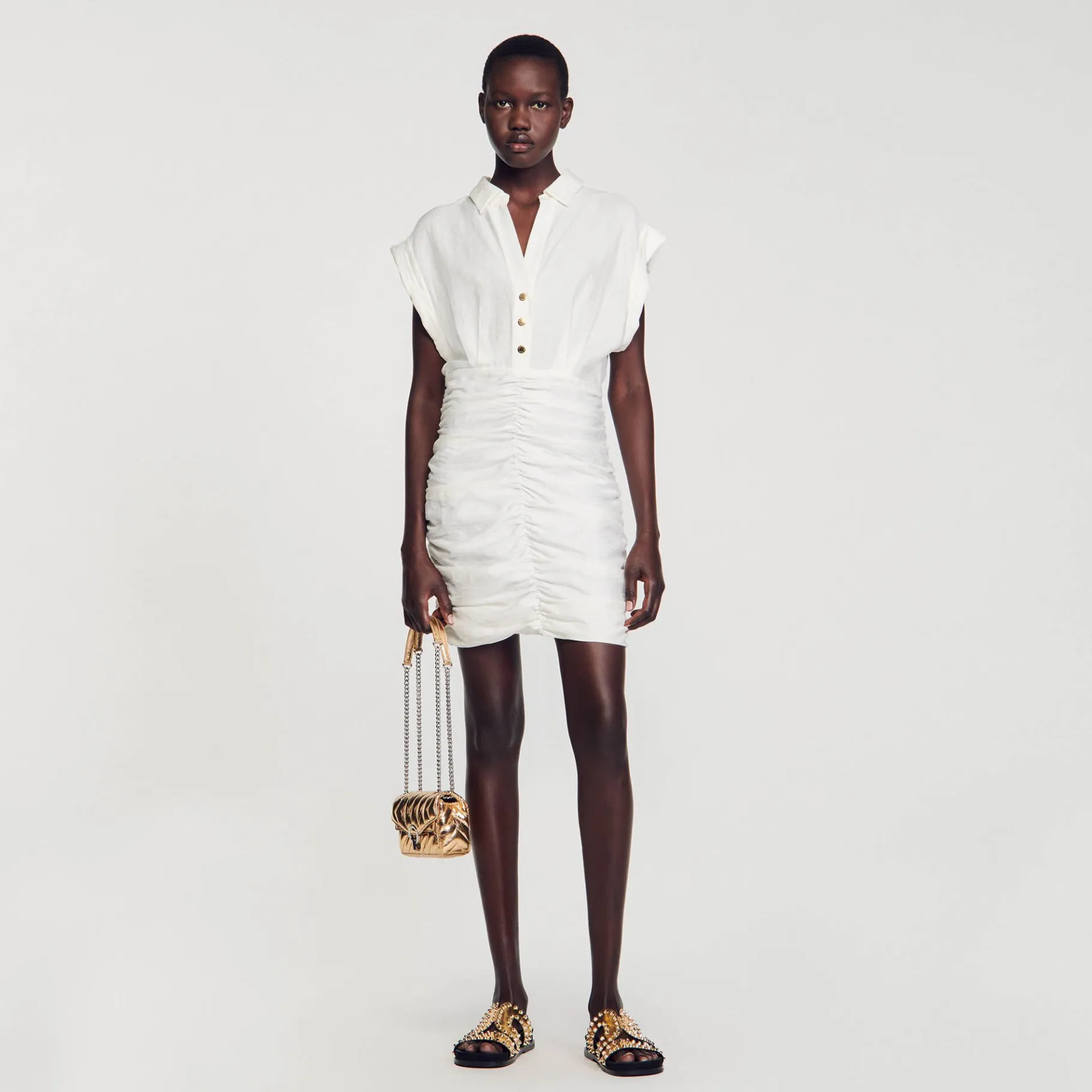 Vestido Curto Sem Mangas Em Mistura De Linho Com Gola Aberta Com Botões Assimétricos E Saia Justa Franzida.