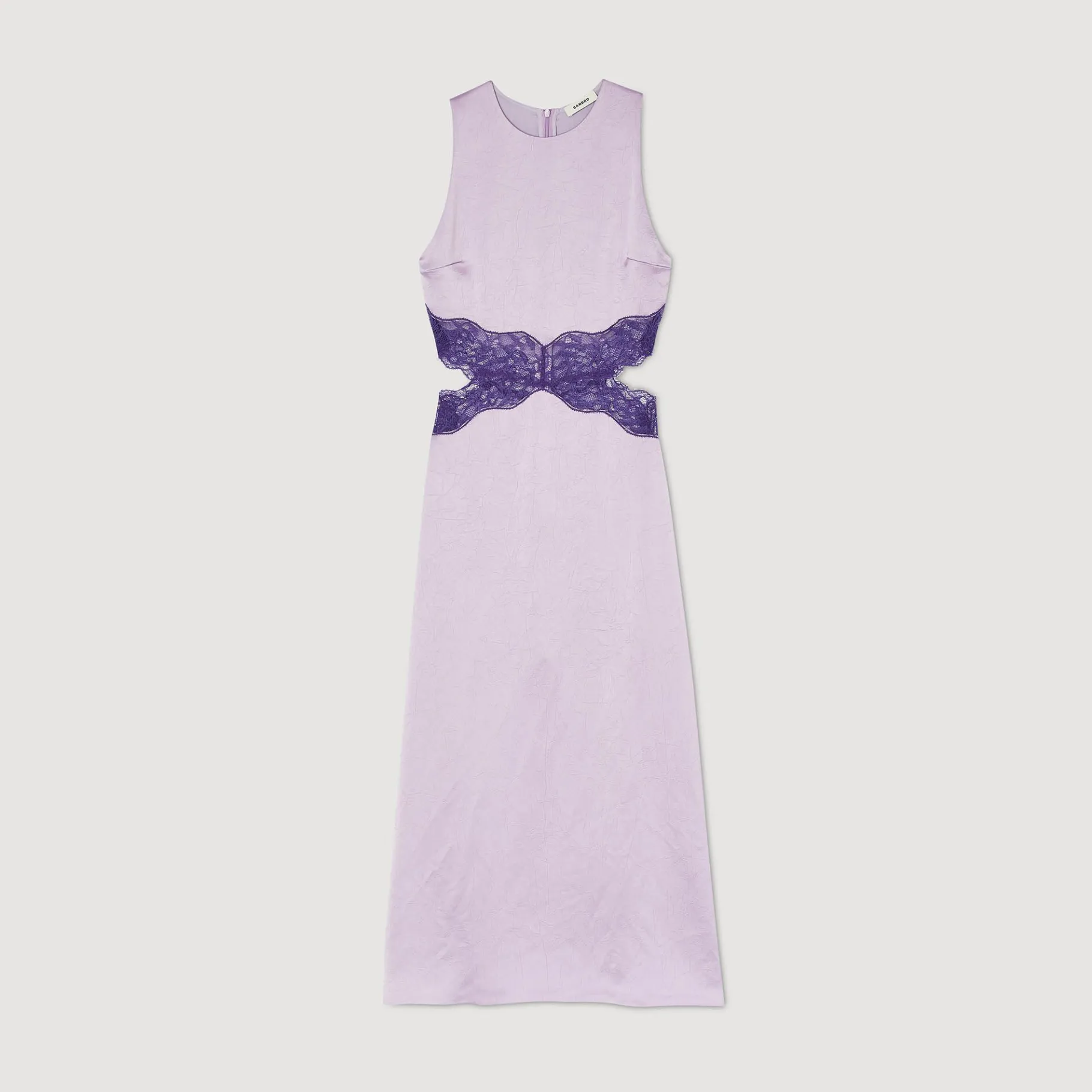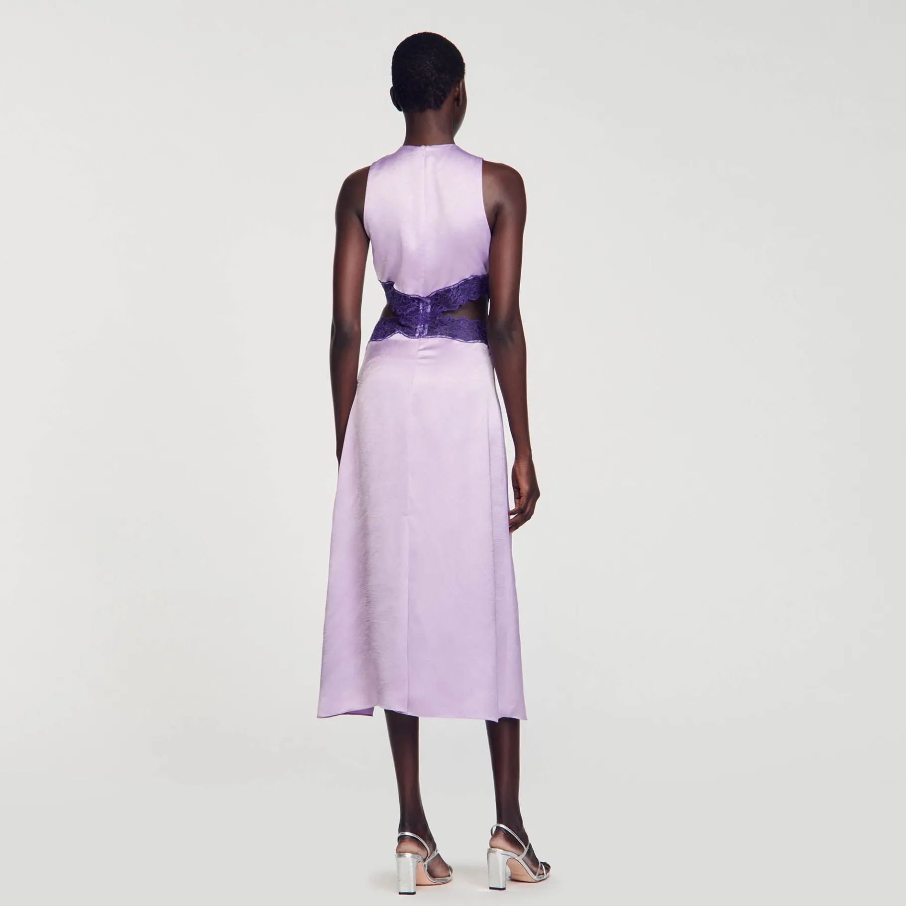 Vestido Midi De Cetim Sem Mangas, Decorado Com Cinto De Renda Em Contraste E Inserções Vazadas Na Cintura.
