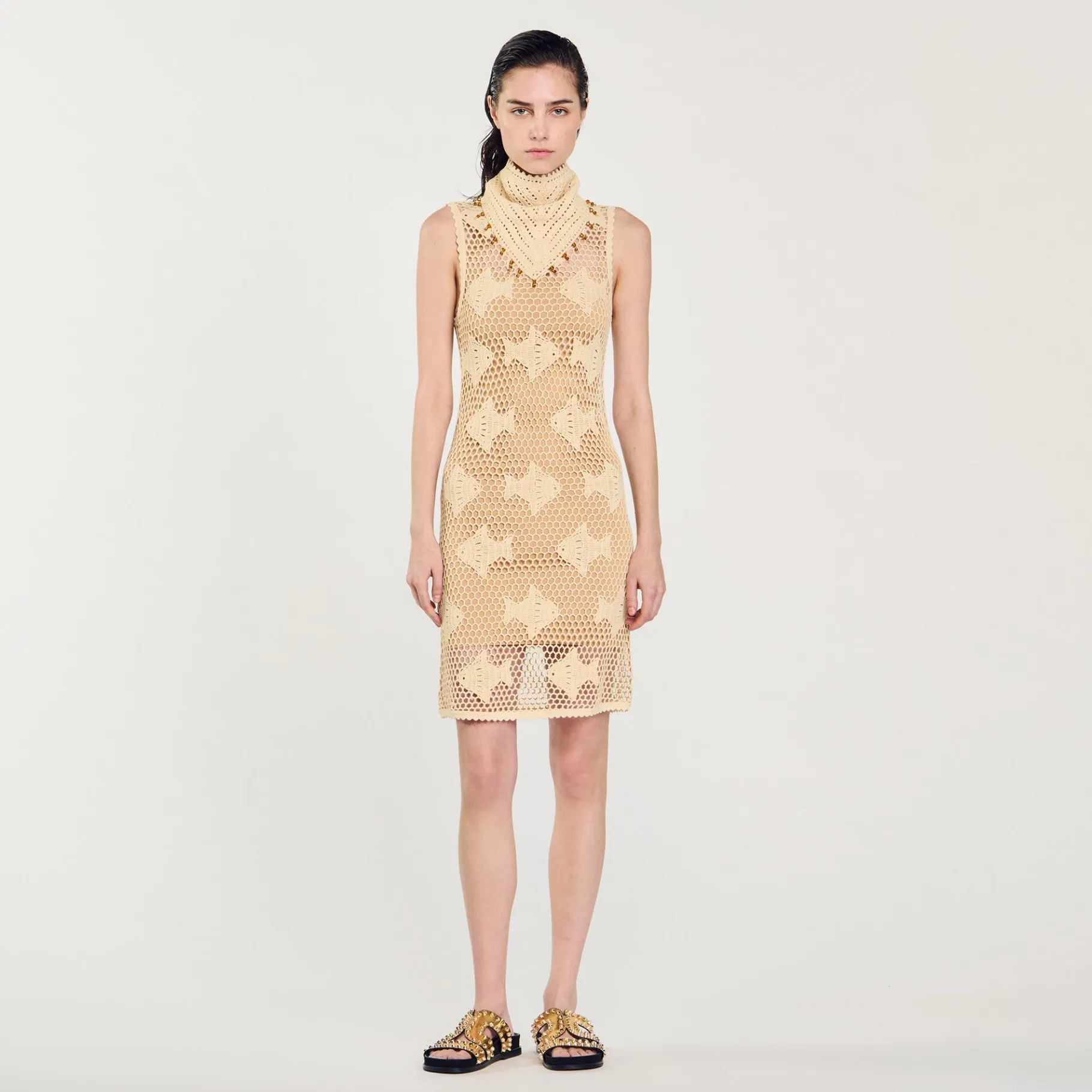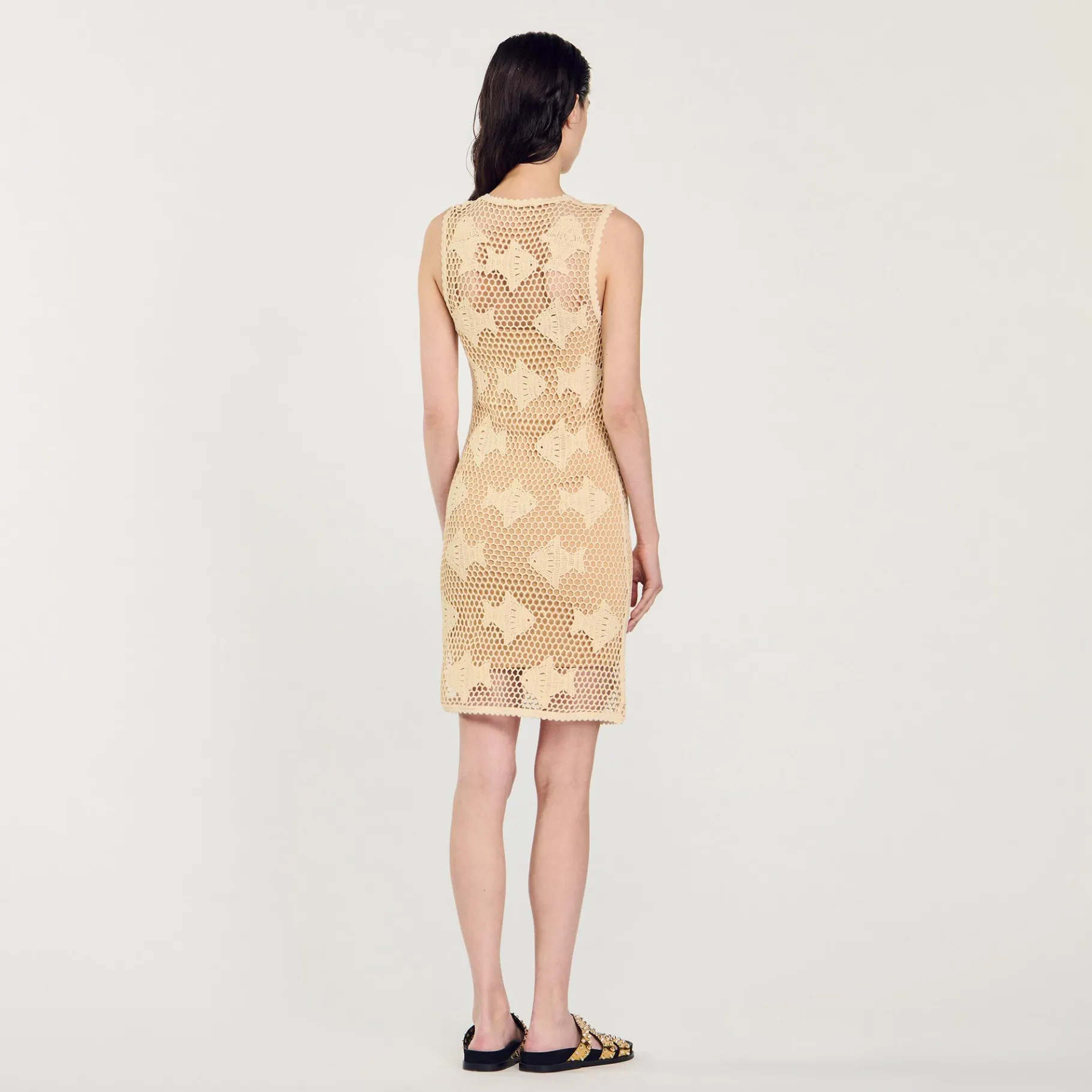 Vestido Curto Sem Mangas Em Malha Bordada Com Efeito Crochê Com Motivo De Peixe, Decote Redondo E Forro Com Alças Finas.