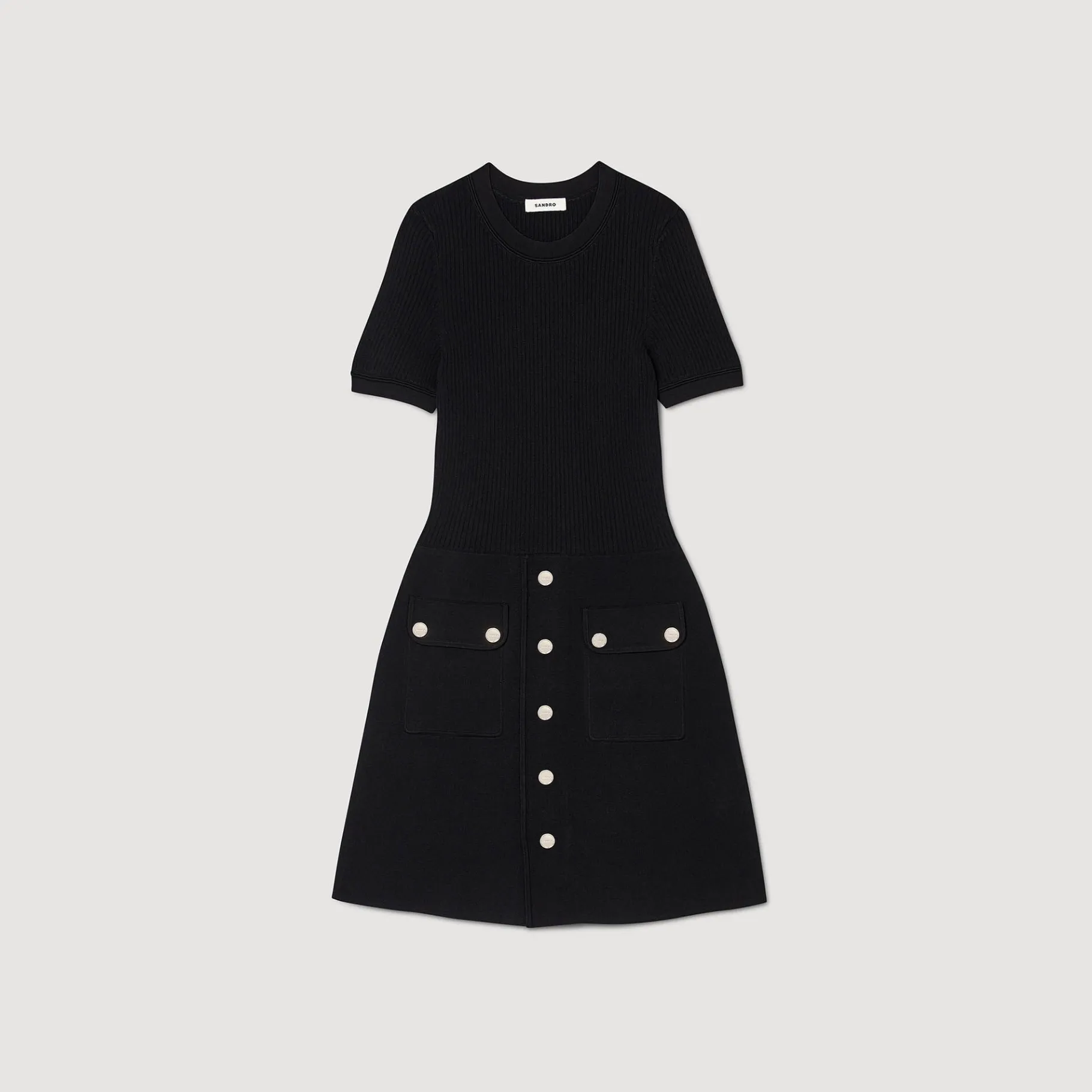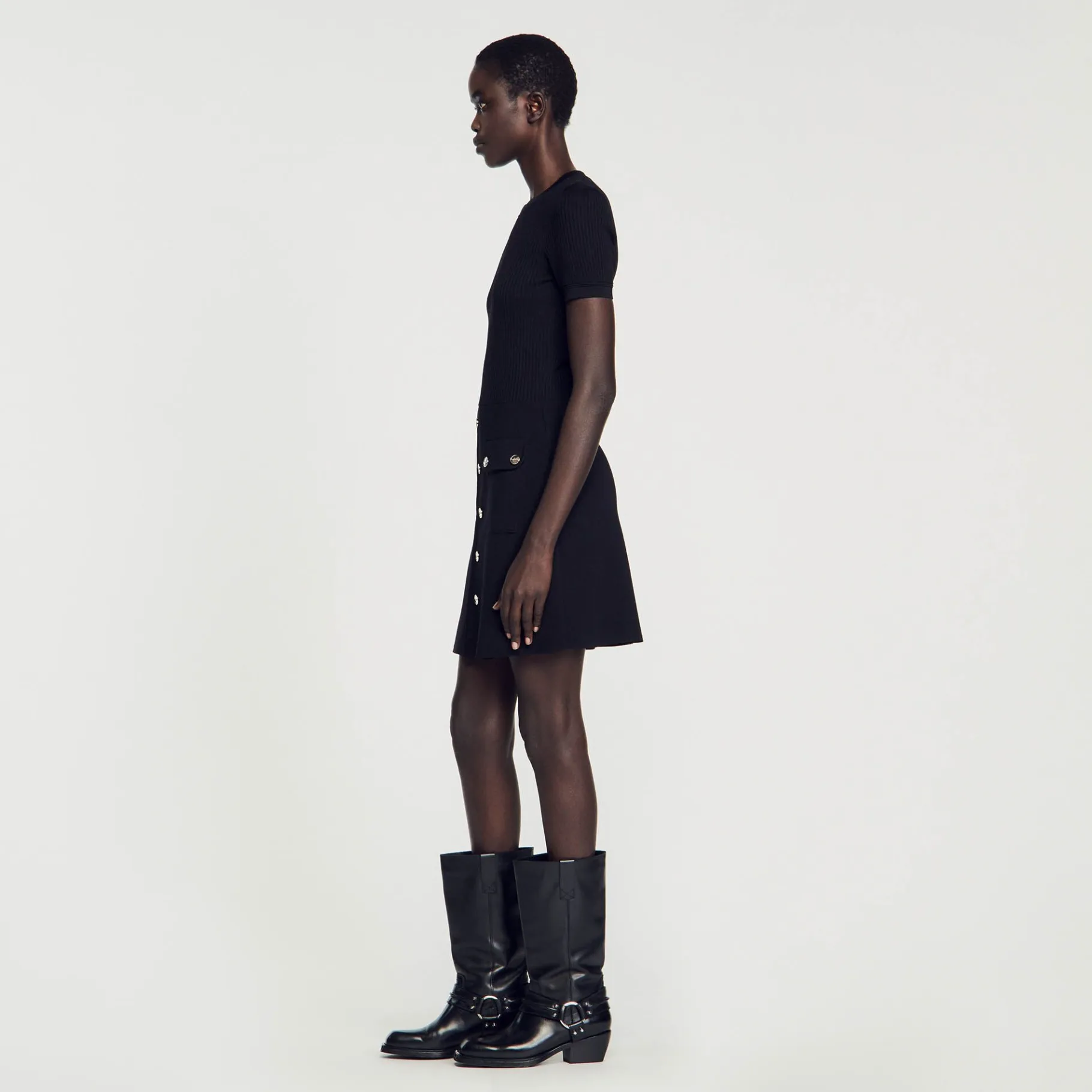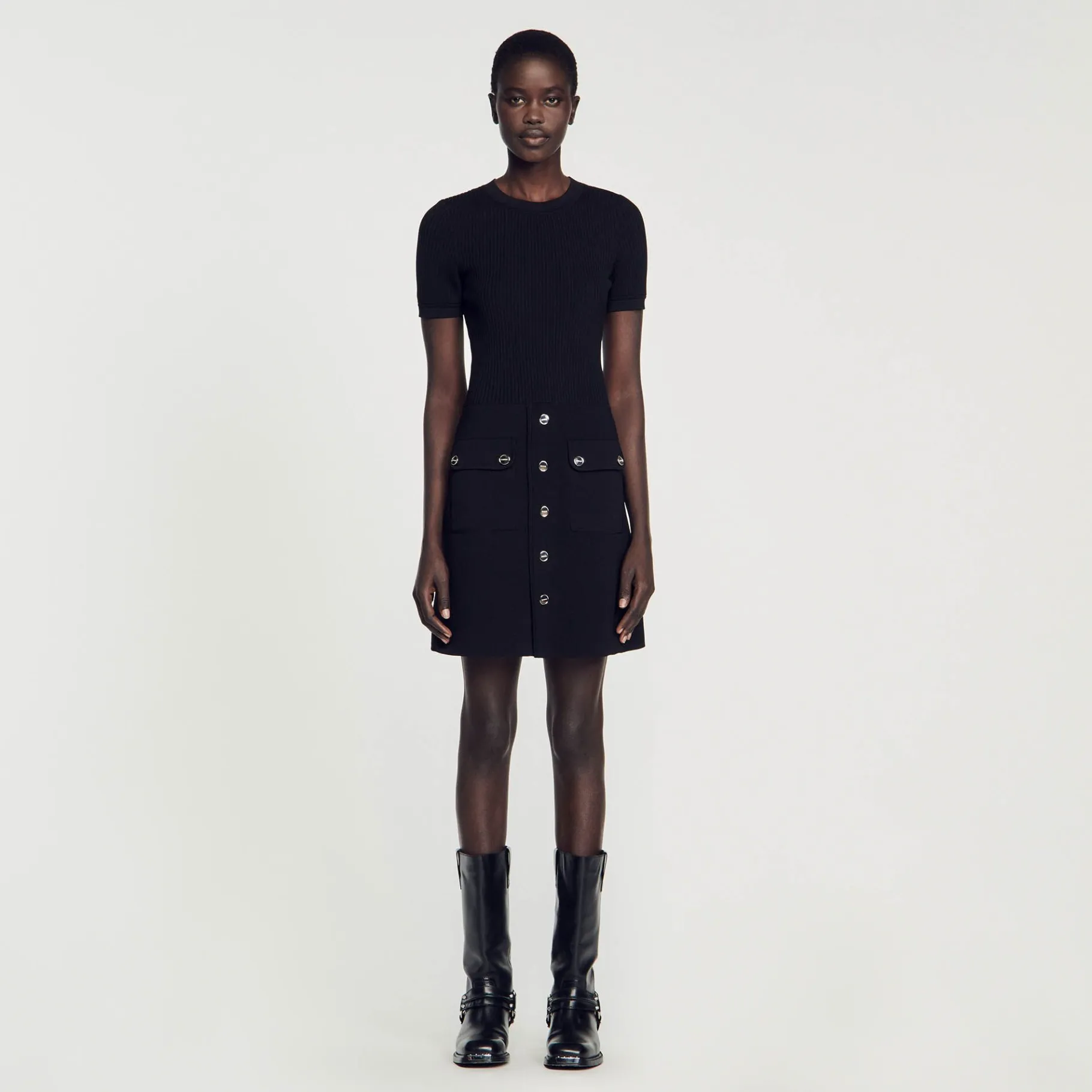 Vestido Curto De Malha Sem Mangas, Saia Larga E Bolsos Com Aba.