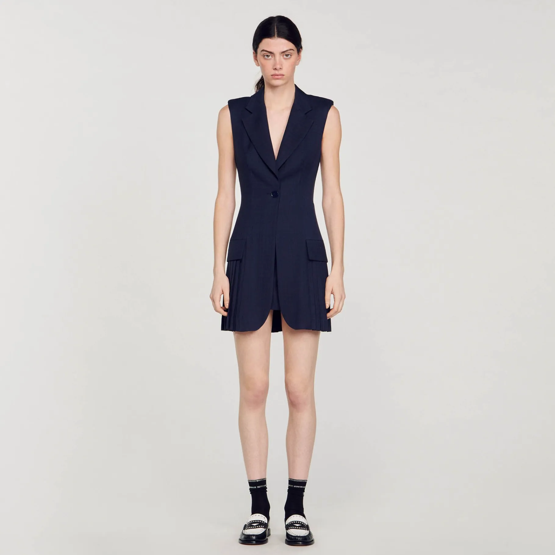 Vestido Curto Estilo Paletó Sem Mangas, Gola Sob Medida Com Lapelas Em V, Fecho De Um Botão, Bolsos Com Aba E Saia Plissada.
