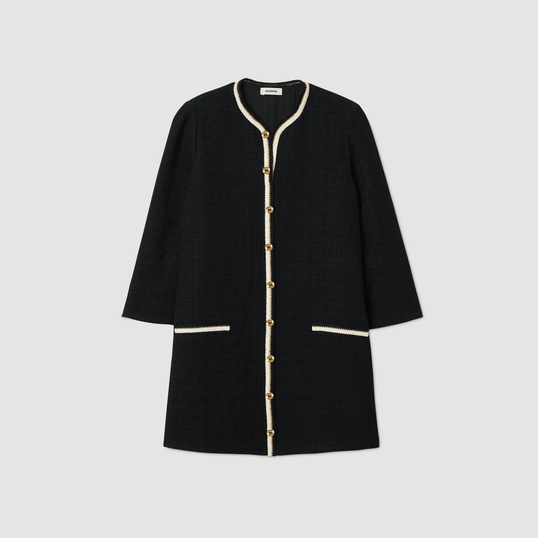 Vestido Evasê De Tweed Com Decote Redondo E Mangas Largas, Decorado Com Trança Contrastante Na Bainha E Nos Bolsos, E Carcela De Botões Dourados Com Duplo S.