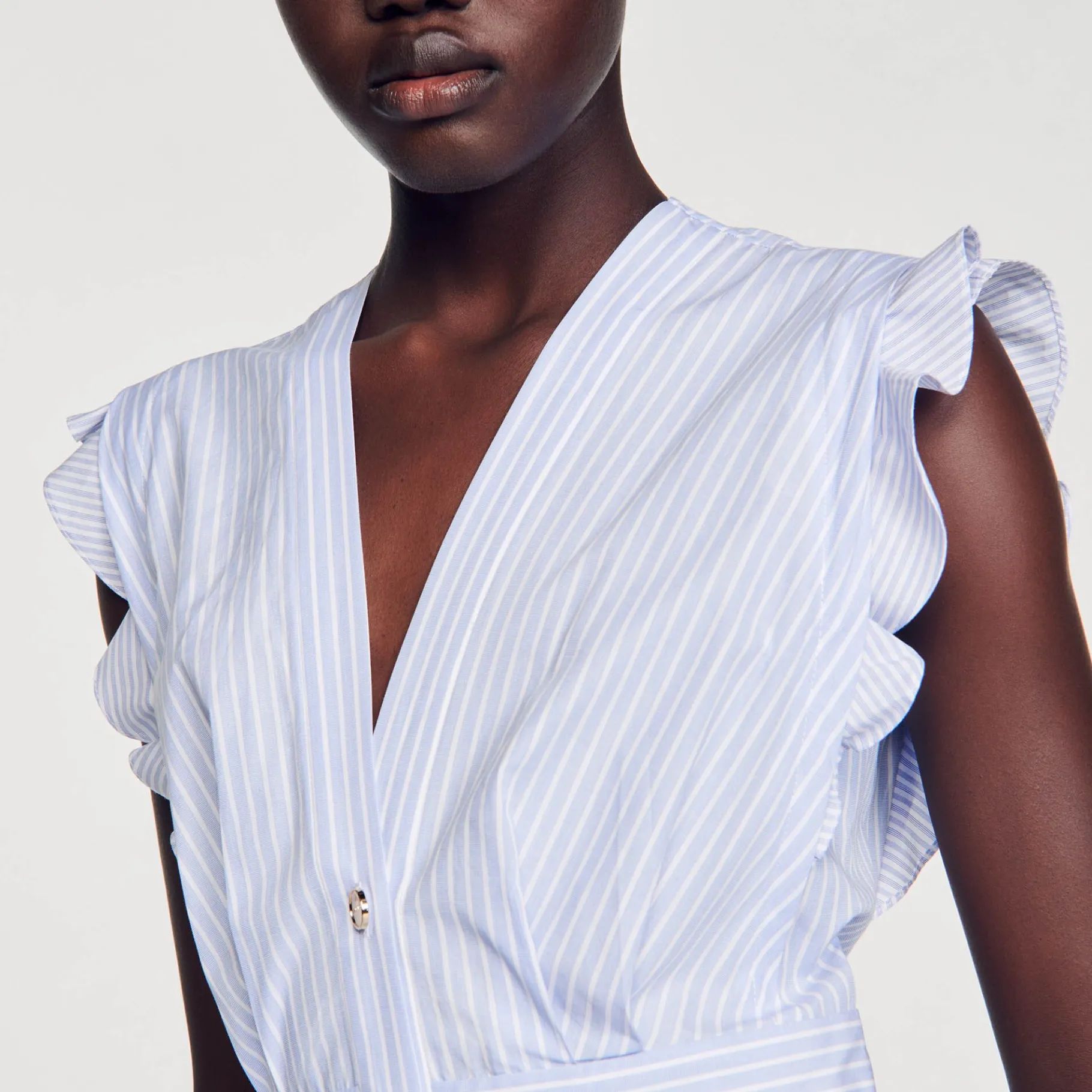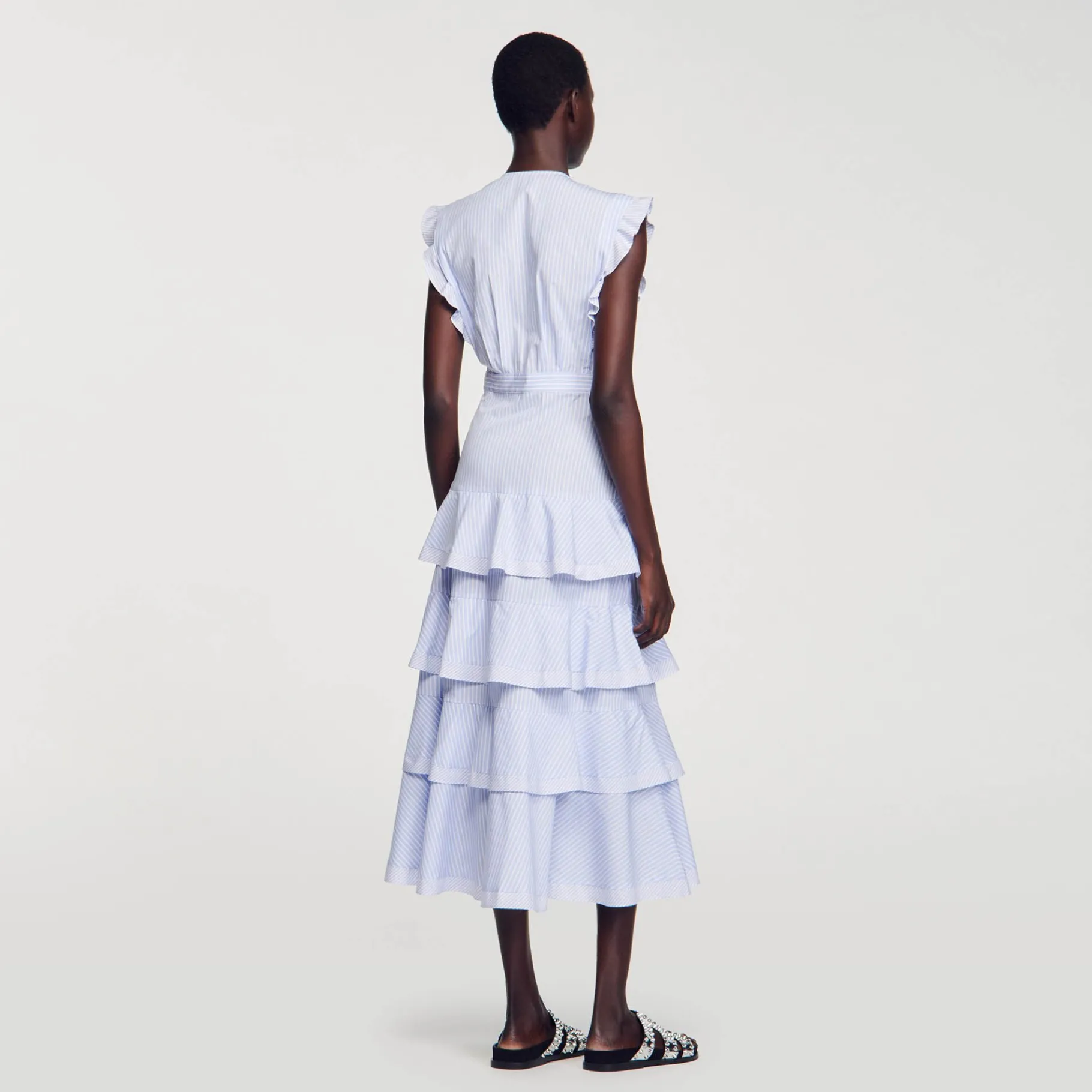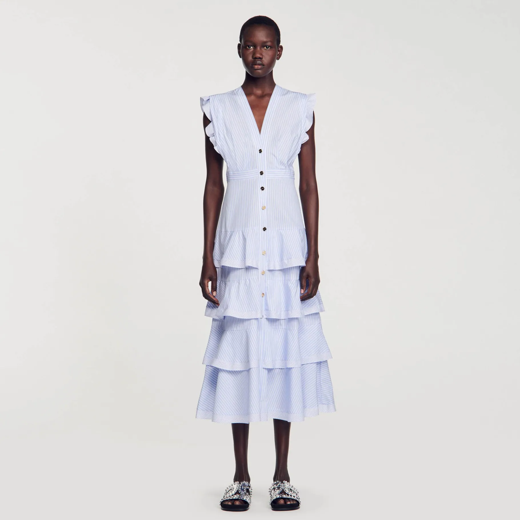 Vestido Longo De Popeline De Algodão Às Riscas, Com Decote Em V, Fecho De Botões E Folhos Na Saia E Nas Cavas.
