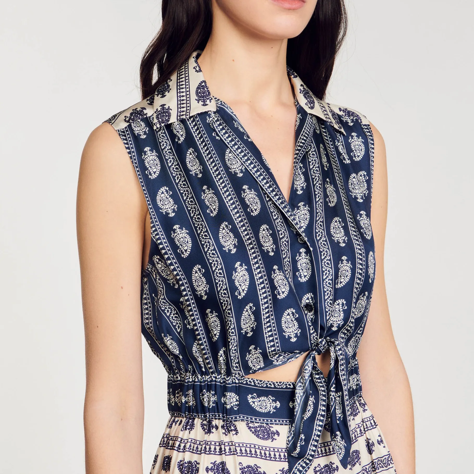 Vestido Longo Sem Mangas Com Top Tipo Camisa Com Abertura, Botões E Laço Na Frente, Saia Larga E Estampa Paisley.